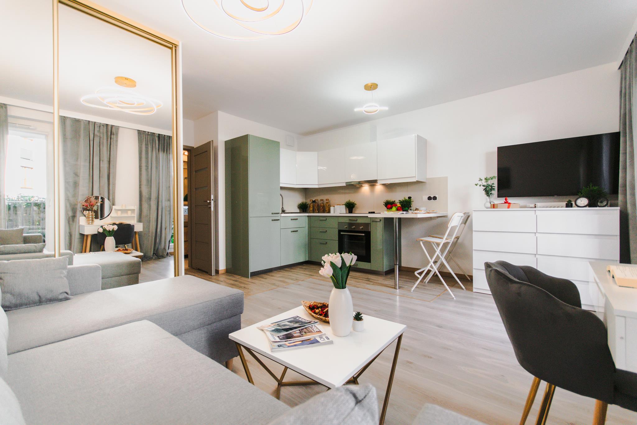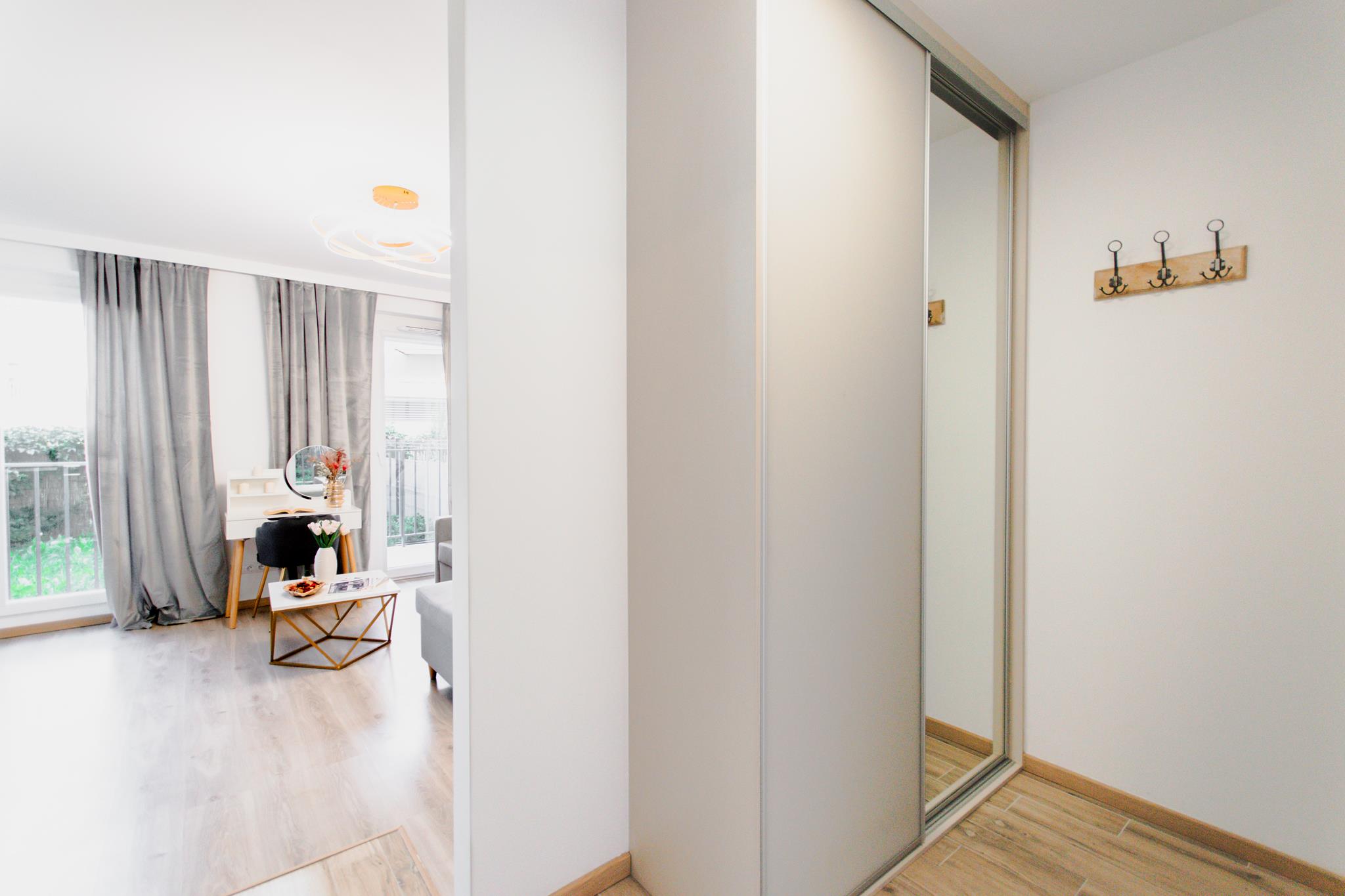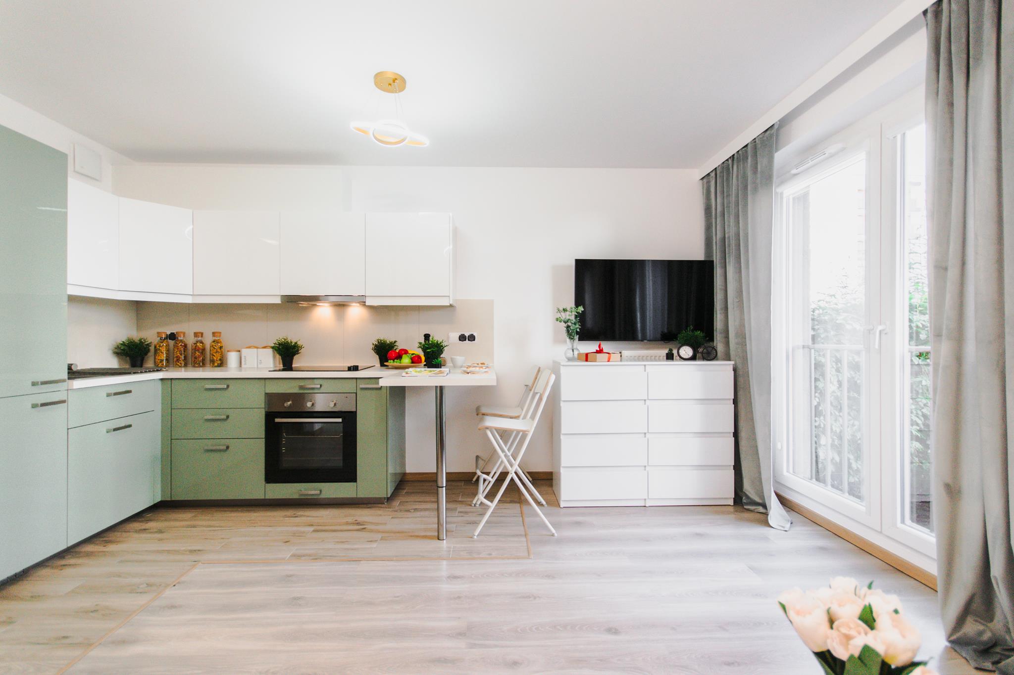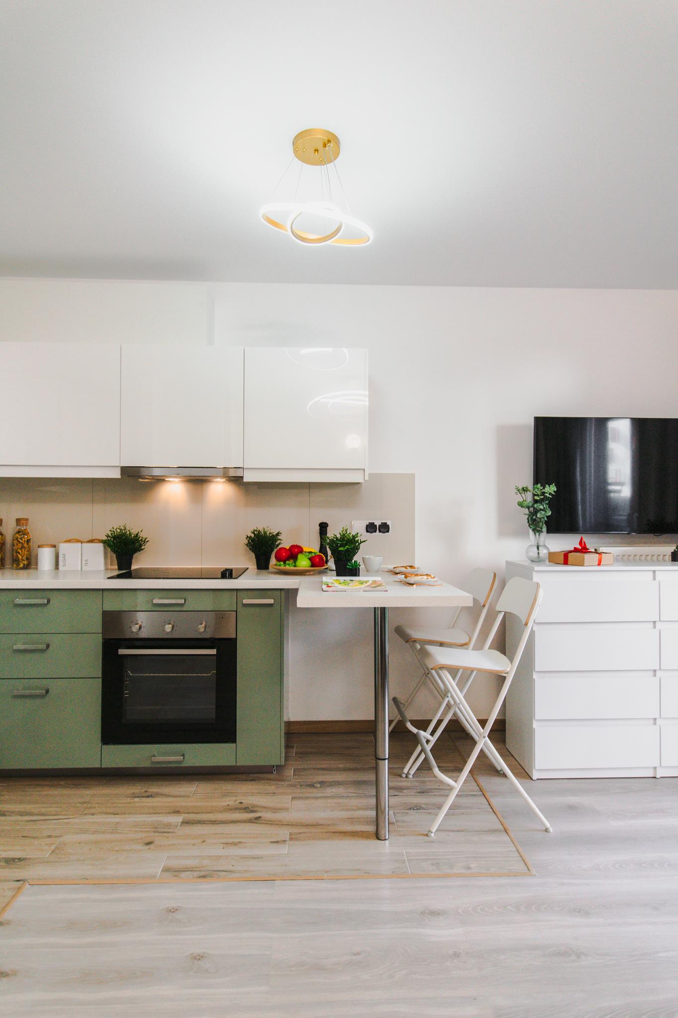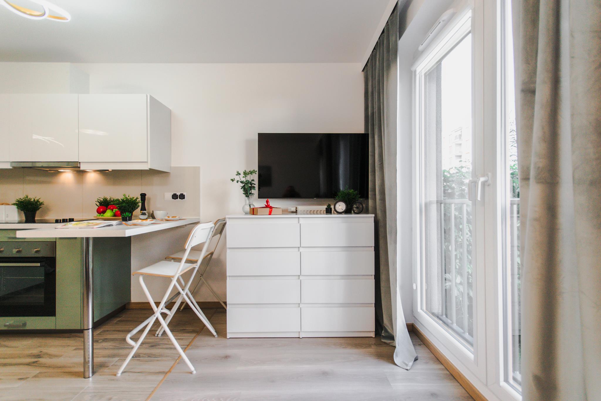 W mieszkaniu znajdziesz salon z wygodnym łóżkiem, dużą, pojemną szafą z lustrami oraz szafkami do przechowywania i biurkiem do pracy czy nauki. Aneks kuchenny z miejscem do wygodnego zjedzenia posiłków wraz z pełnym wyposażeniem takim jak: