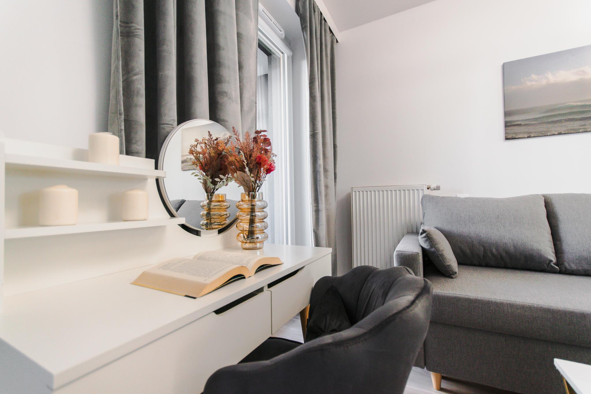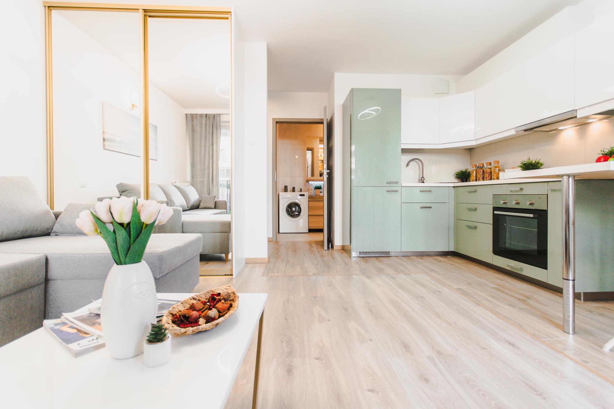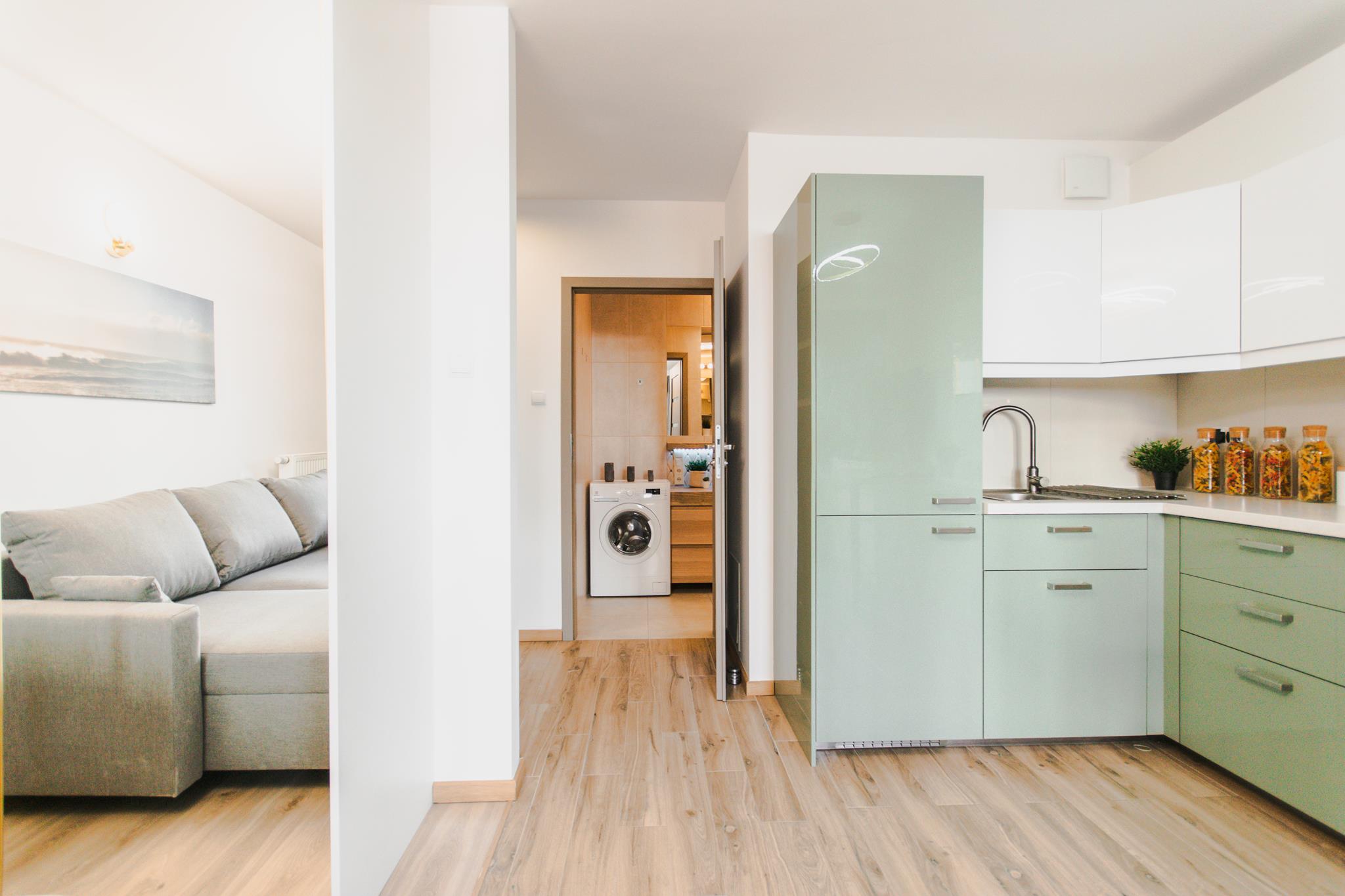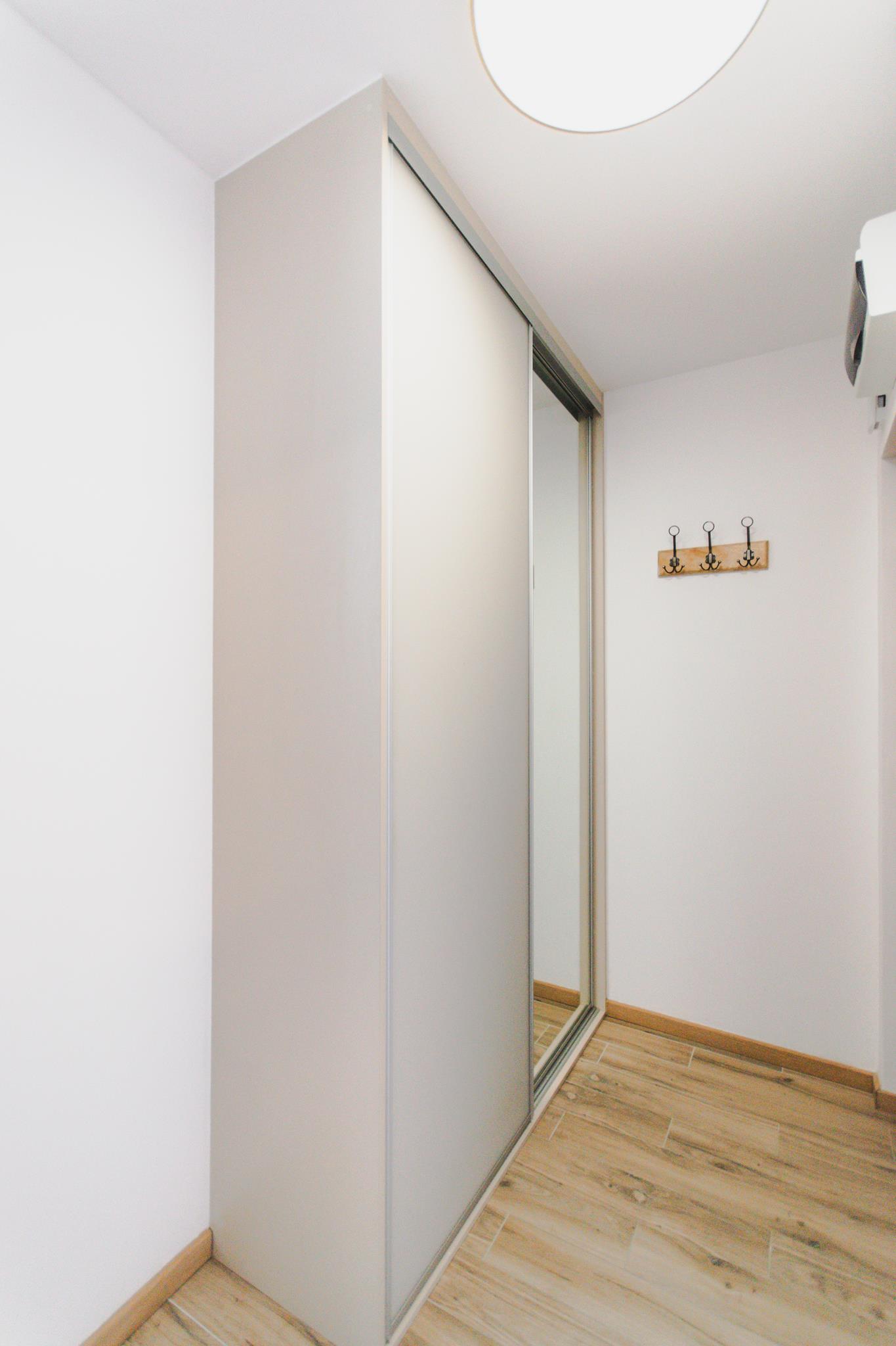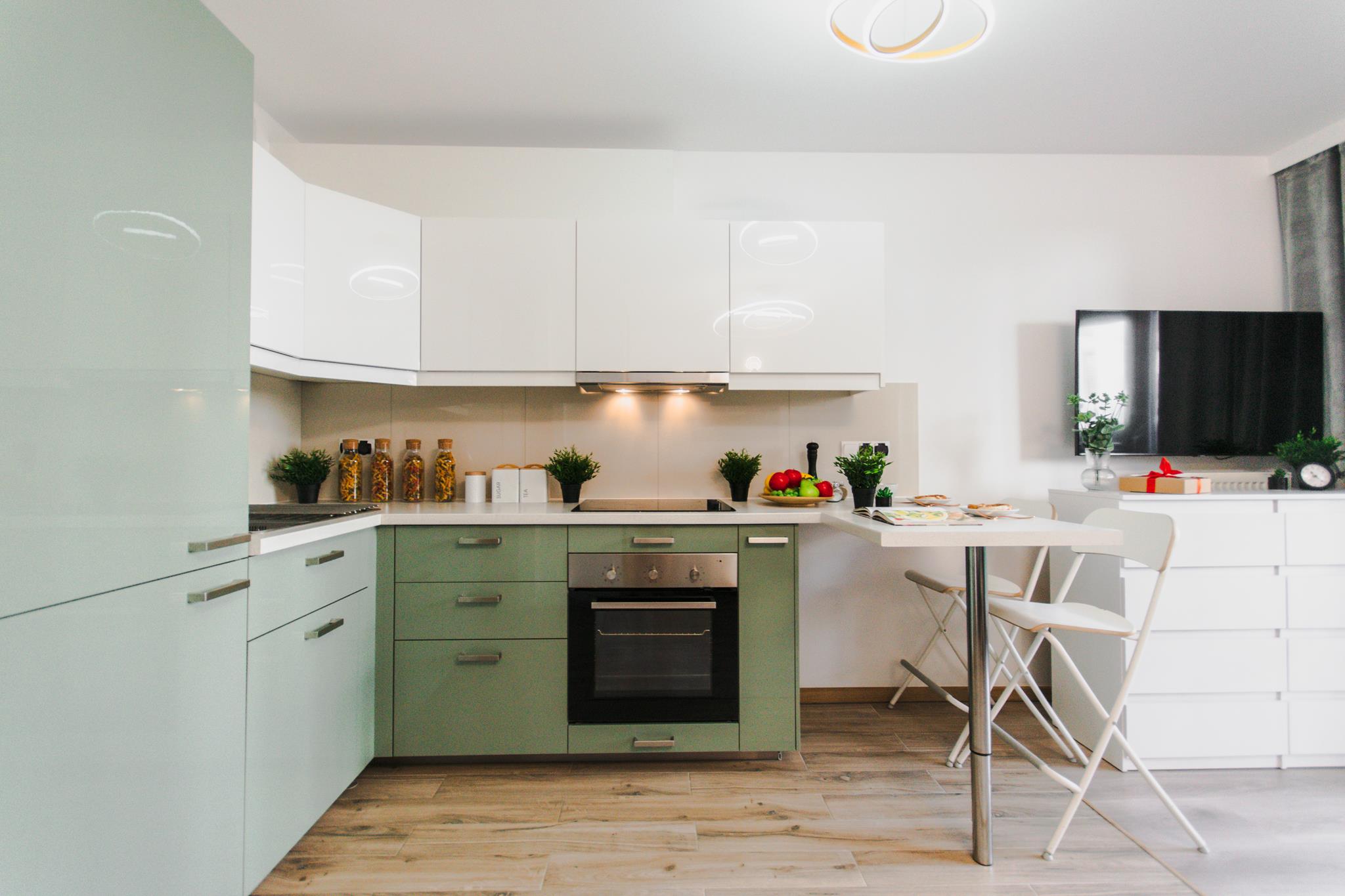 W mieszkaniu znajdziesz salon z wygodnym łóżkiem, dużą, pojemną szafą z lustrami oraz szafkami do przechowywania i biurkiem do pracy czy nauki. Aneks kuchenny z miejscem do wygodnego zjedzenia posiłków wraz z pełnym wyposażeniem takim jak: