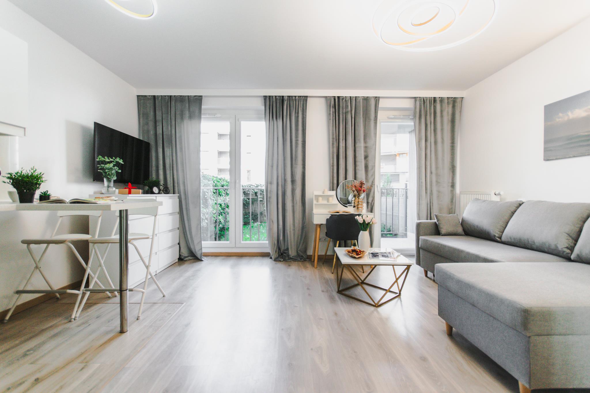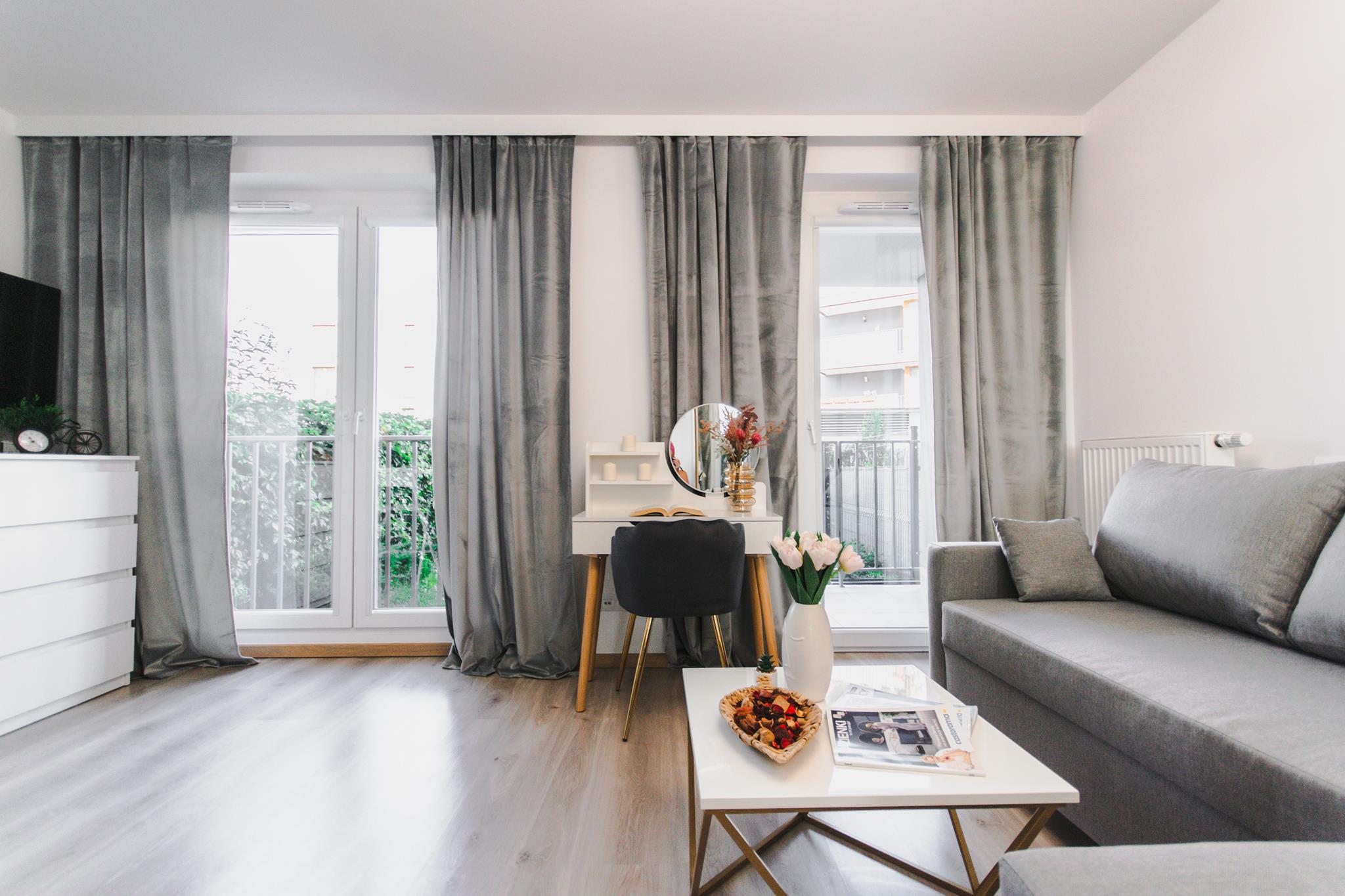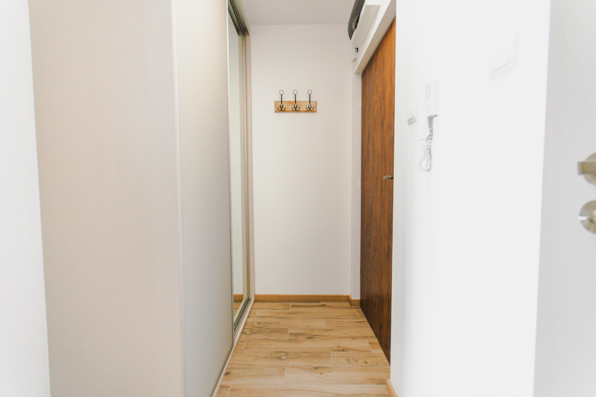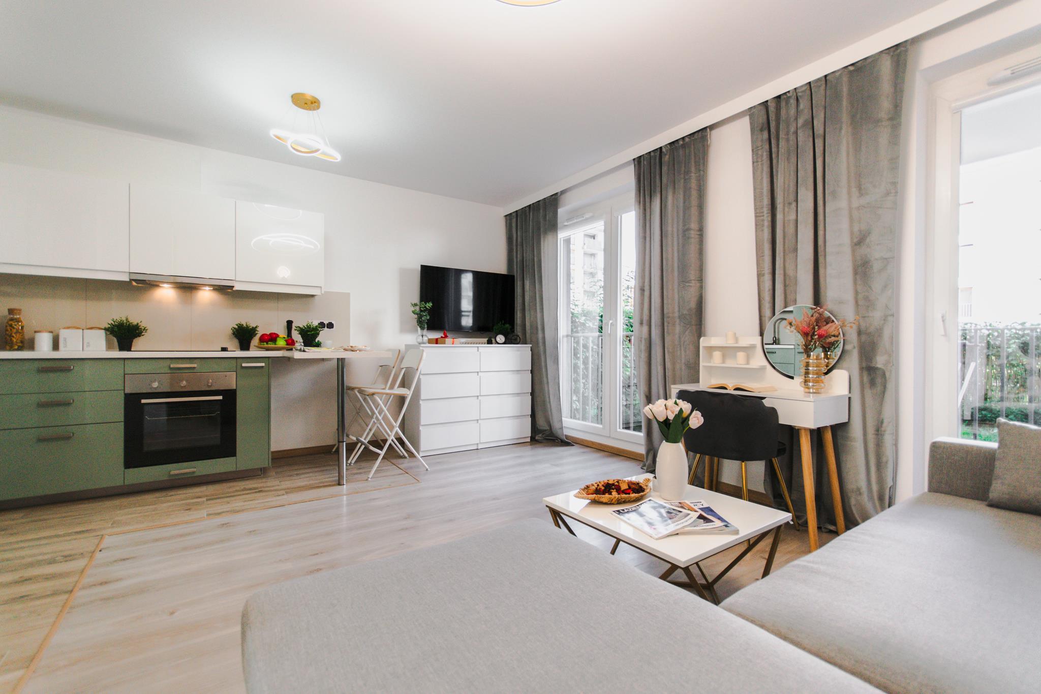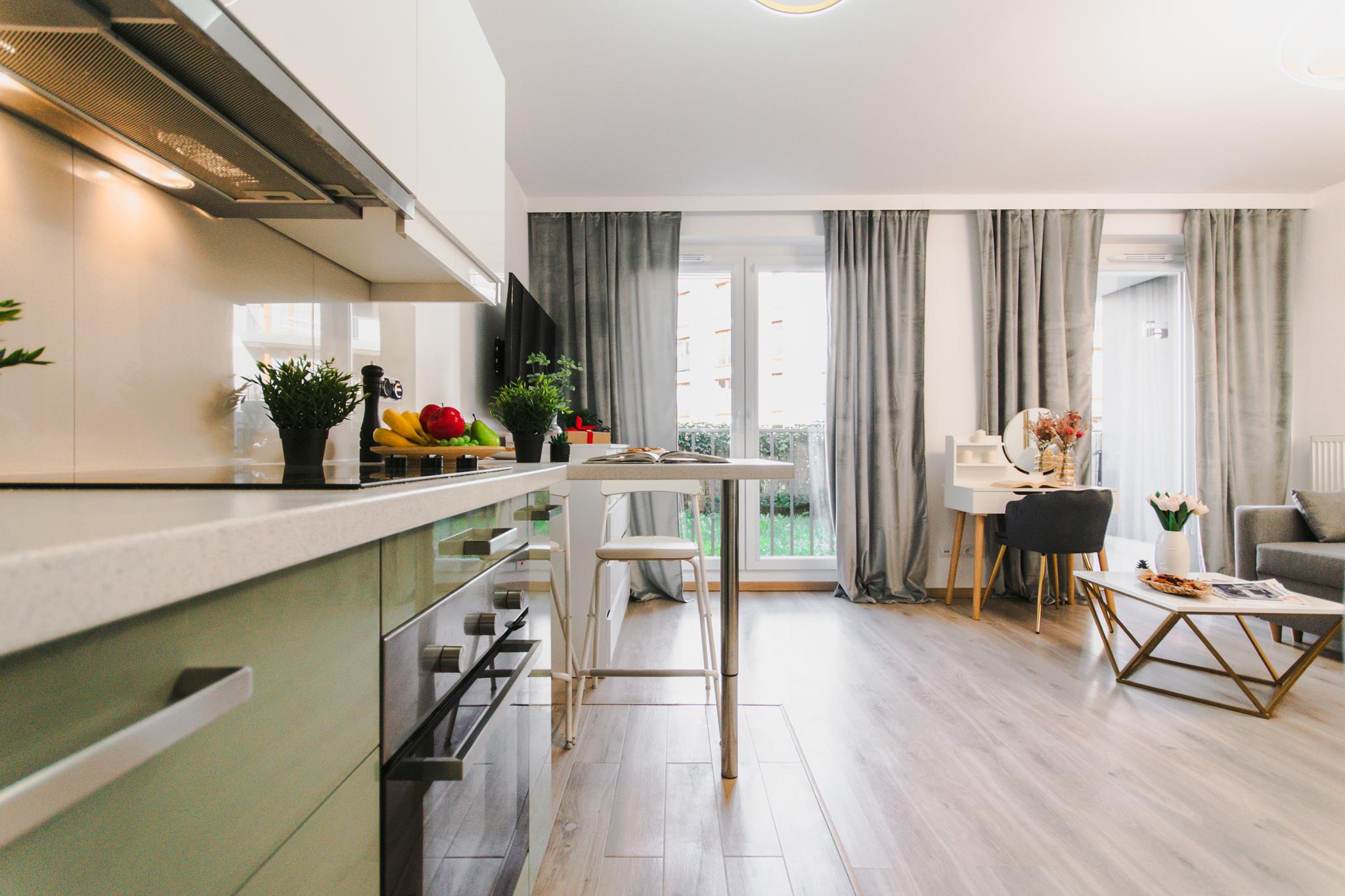W mieszkaniu znajdziesz salon z wygodnym łóżkiem, dużą, pojemną szafą z lustrami oraz szafkami do przechowywania i biurkiem do pracy czy nauki. Aneks kuchenny z miejscem do wygodnego zjedzenia posiłków wraz z pełnym wyposażeniem takim jak: