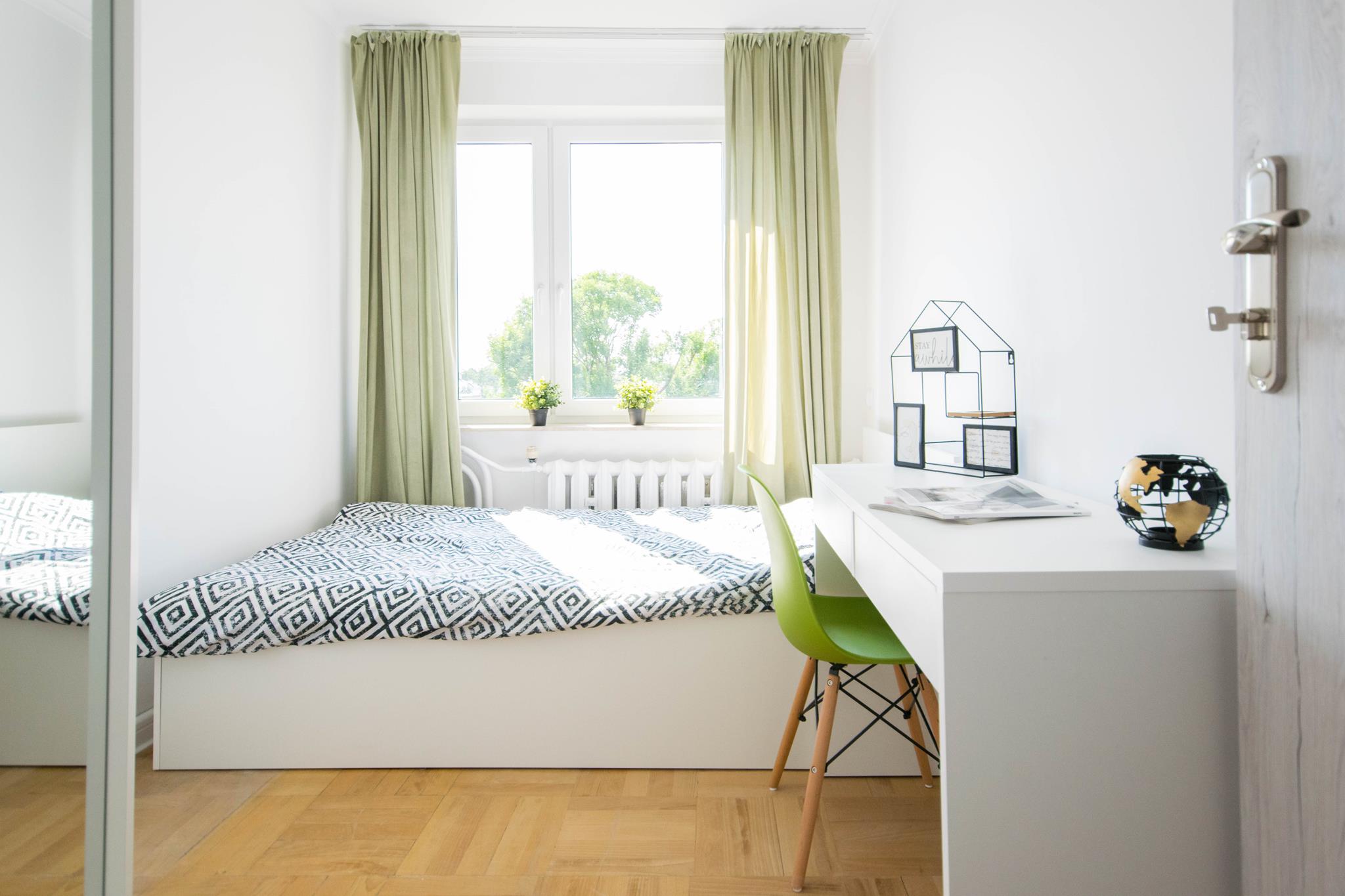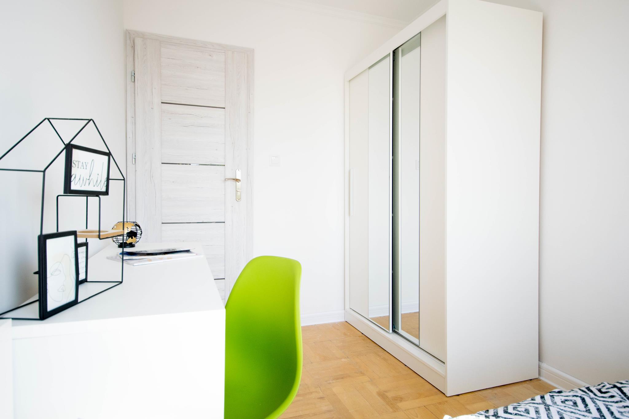 Do dyspozycji mamy 4 niezależne pokoje, w każdym z nich znajduje duża, wysoka, pojemna szafa z lustrem w której można spokojnie zmieścić wszystkie swoje rzeczy, duże, wygodne łóżko z materacem, biurka do pracy wraz z krzesłami.
