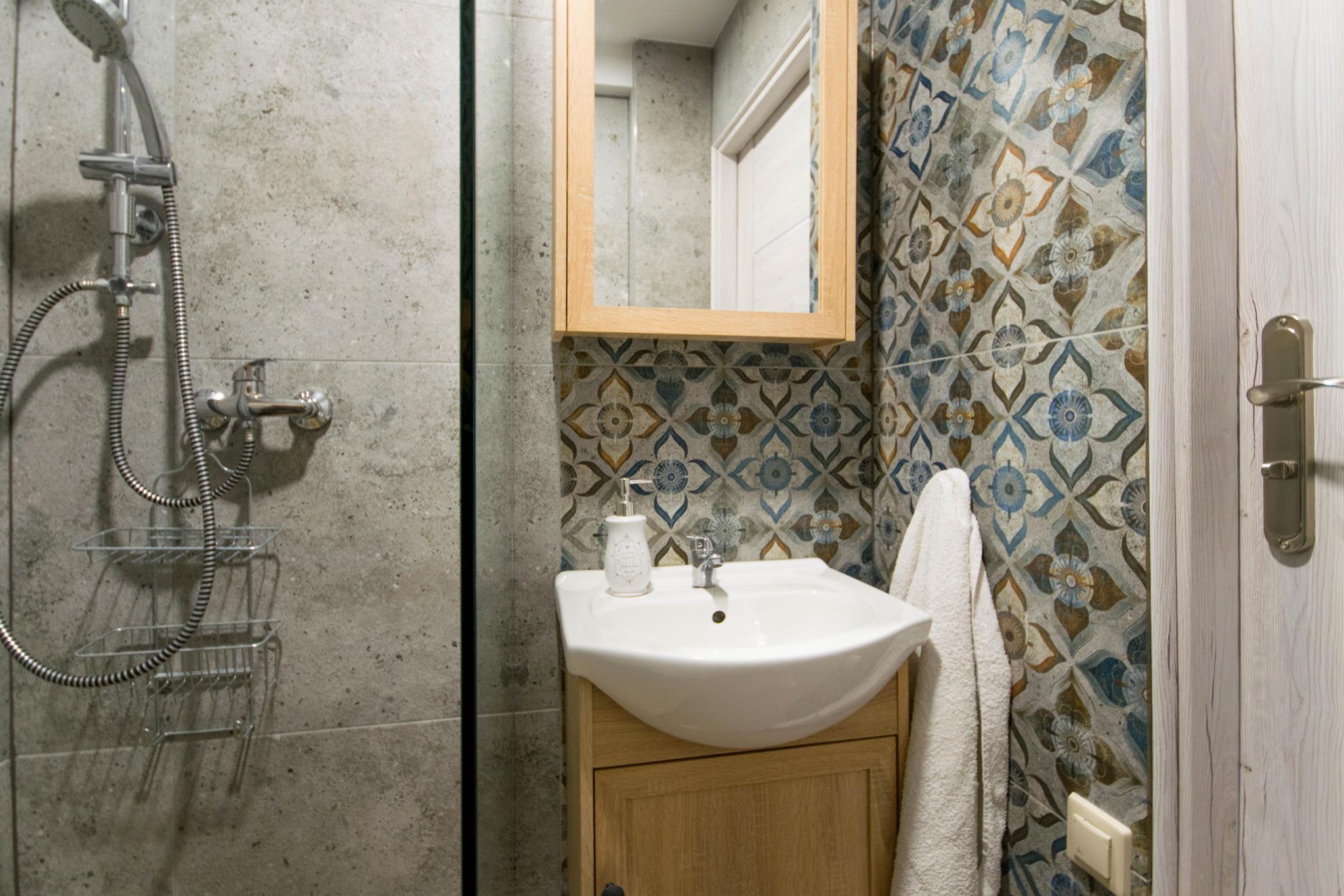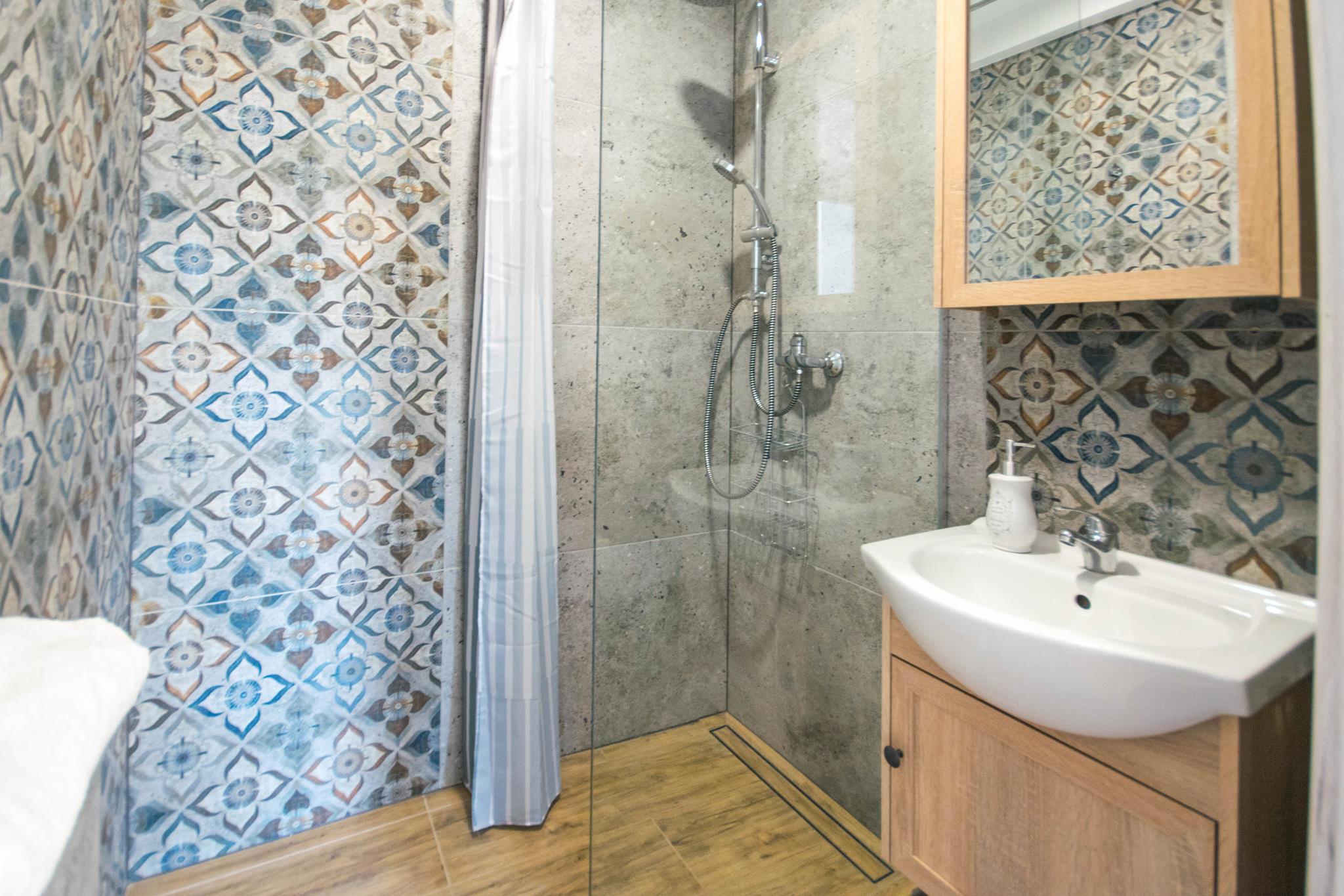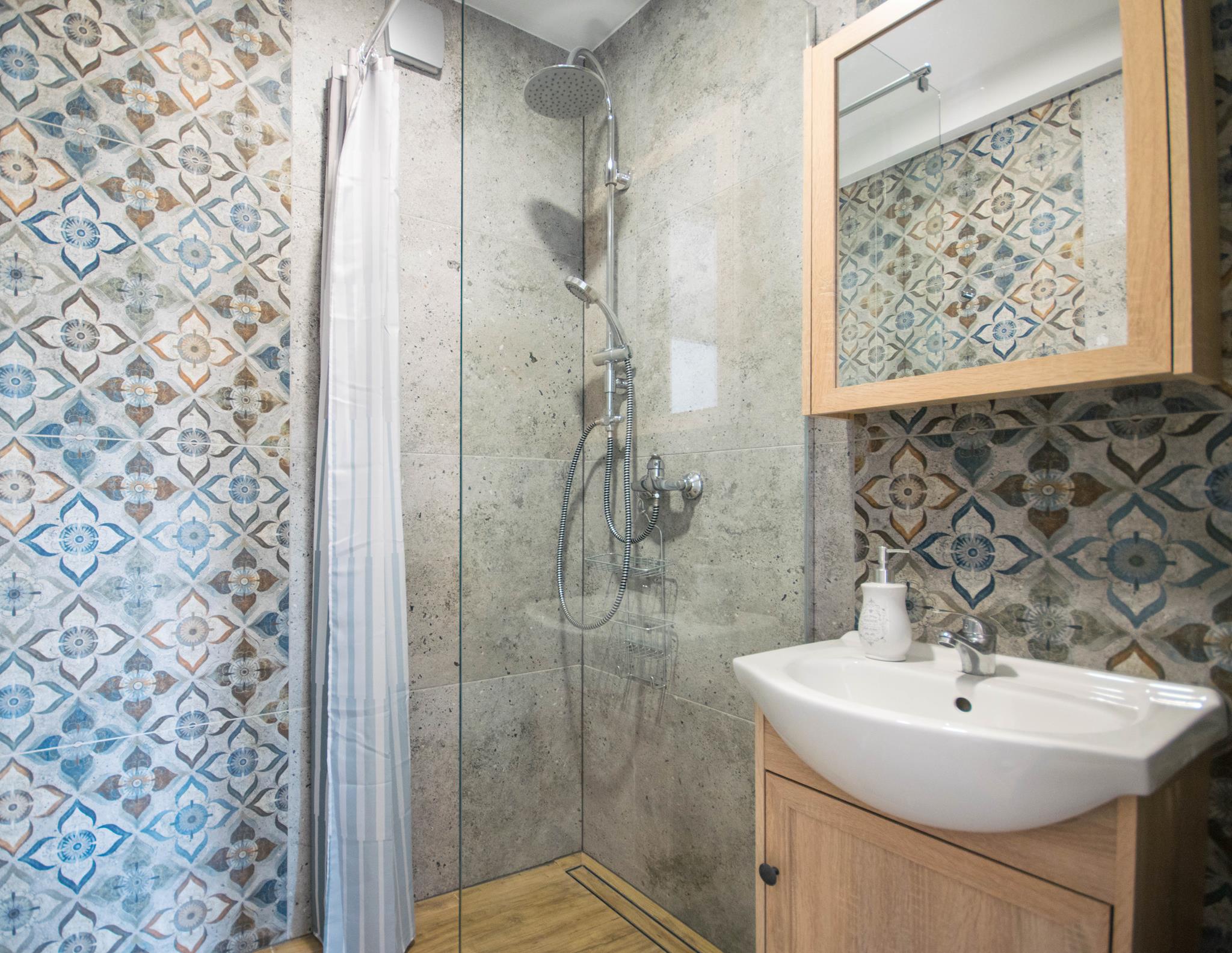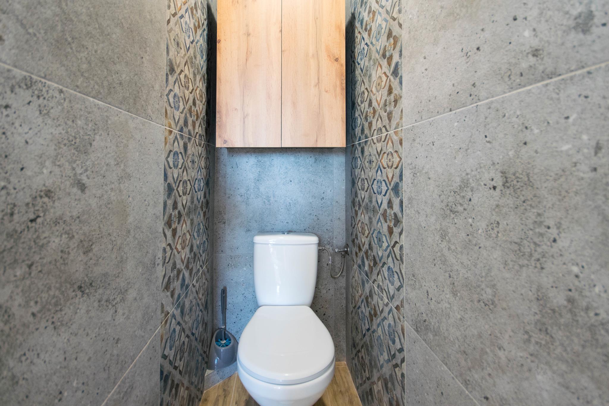 Łazienka z prysznicem, szafkami z miejscem do przechowywania, jak również pralką oraz oddzielne WC z szafką nad toaletą.