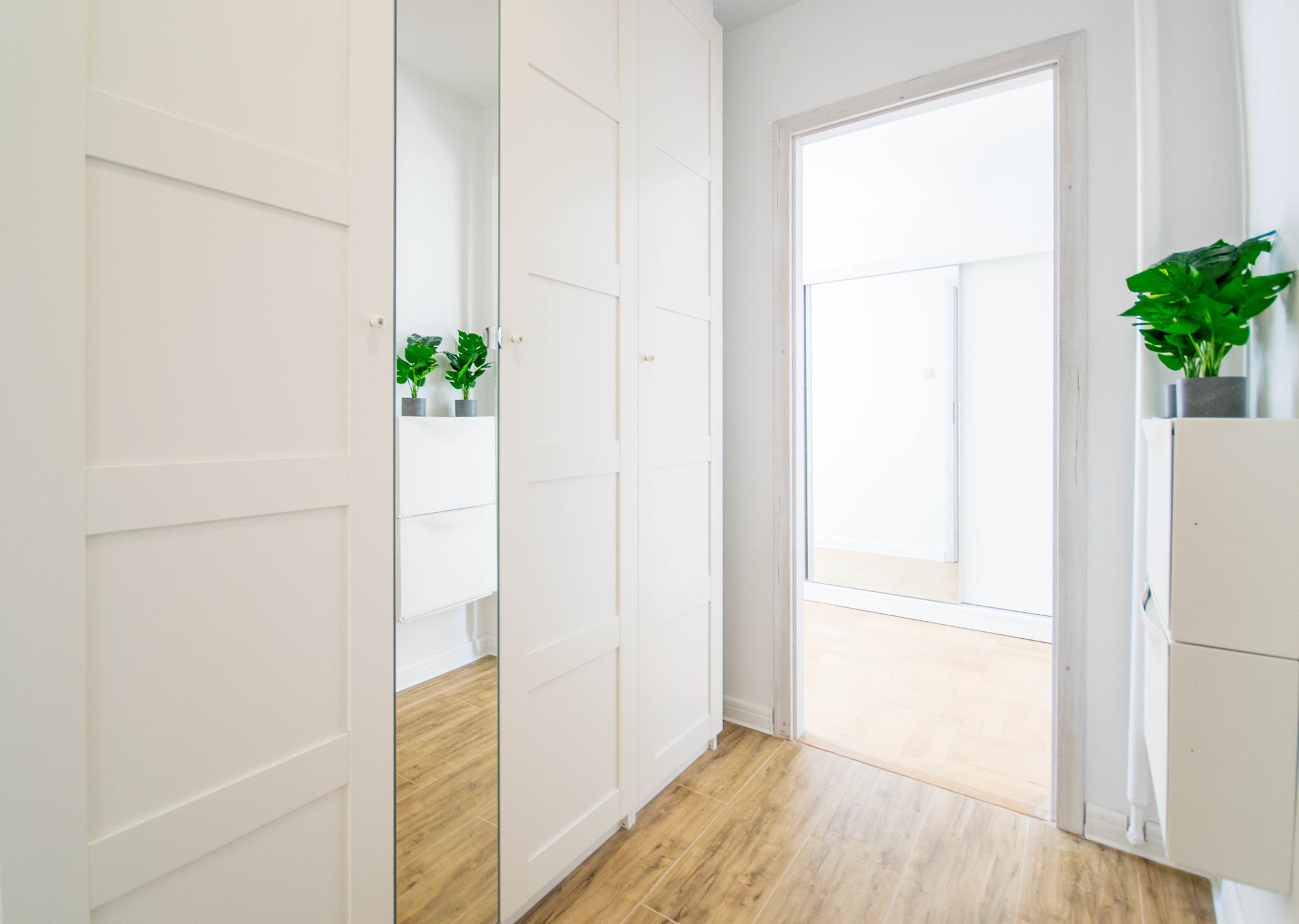 Przedpokój z dużą szafą w zabudowie wraz z lustrem, gdzie można przechowywać ubrania wierzchnie oraz rzeczy mniej użytkowane.