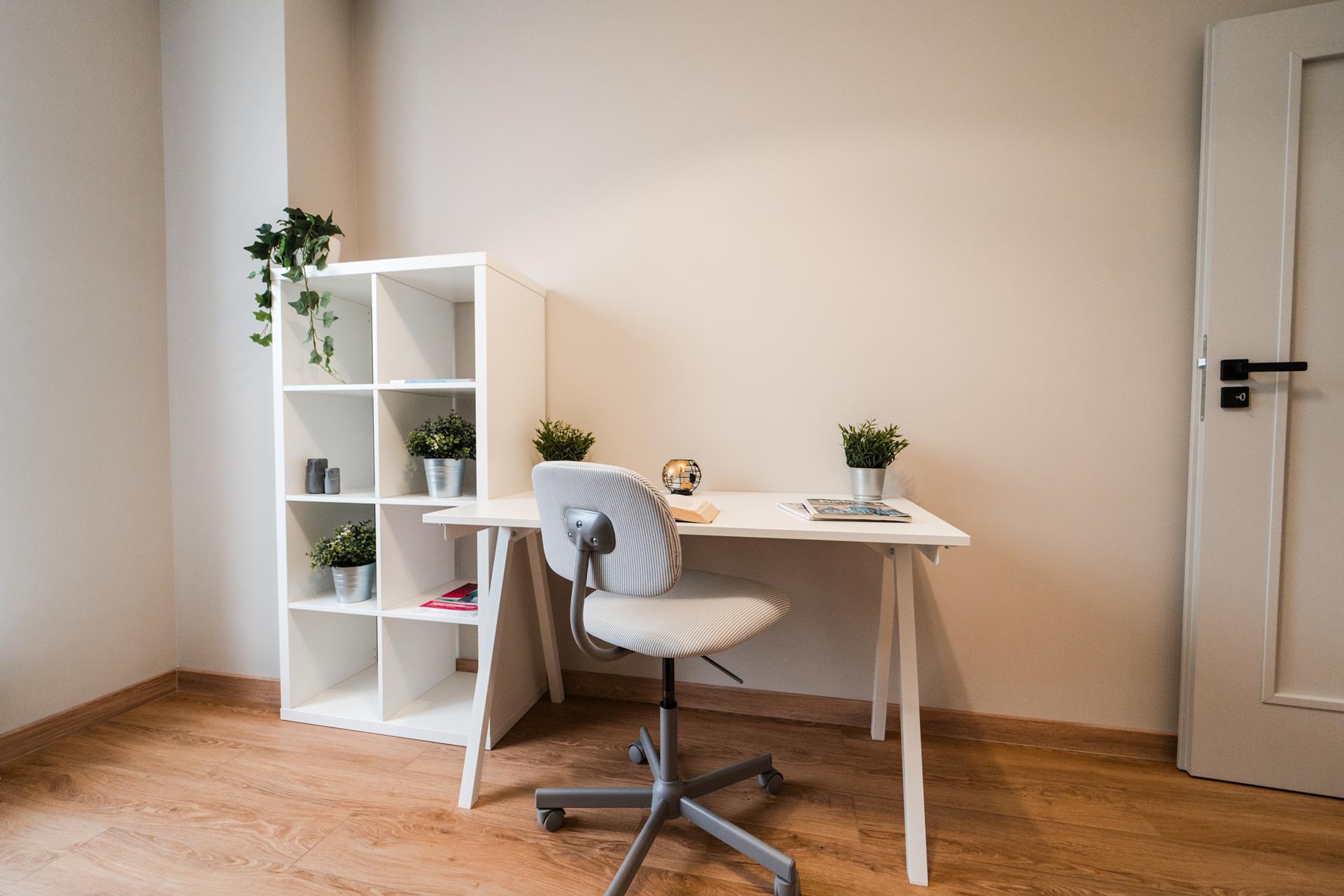 🛏 Pokój nr 1 z wygodną rozkładaną sofą, biurkiem do pracy czy nauki, pojemną szafą oraz półkami