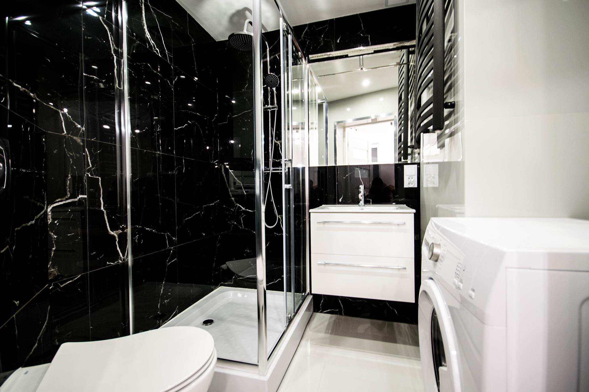 Łazienka z prysznicem, pralką, umywalką, półką i lustrem.