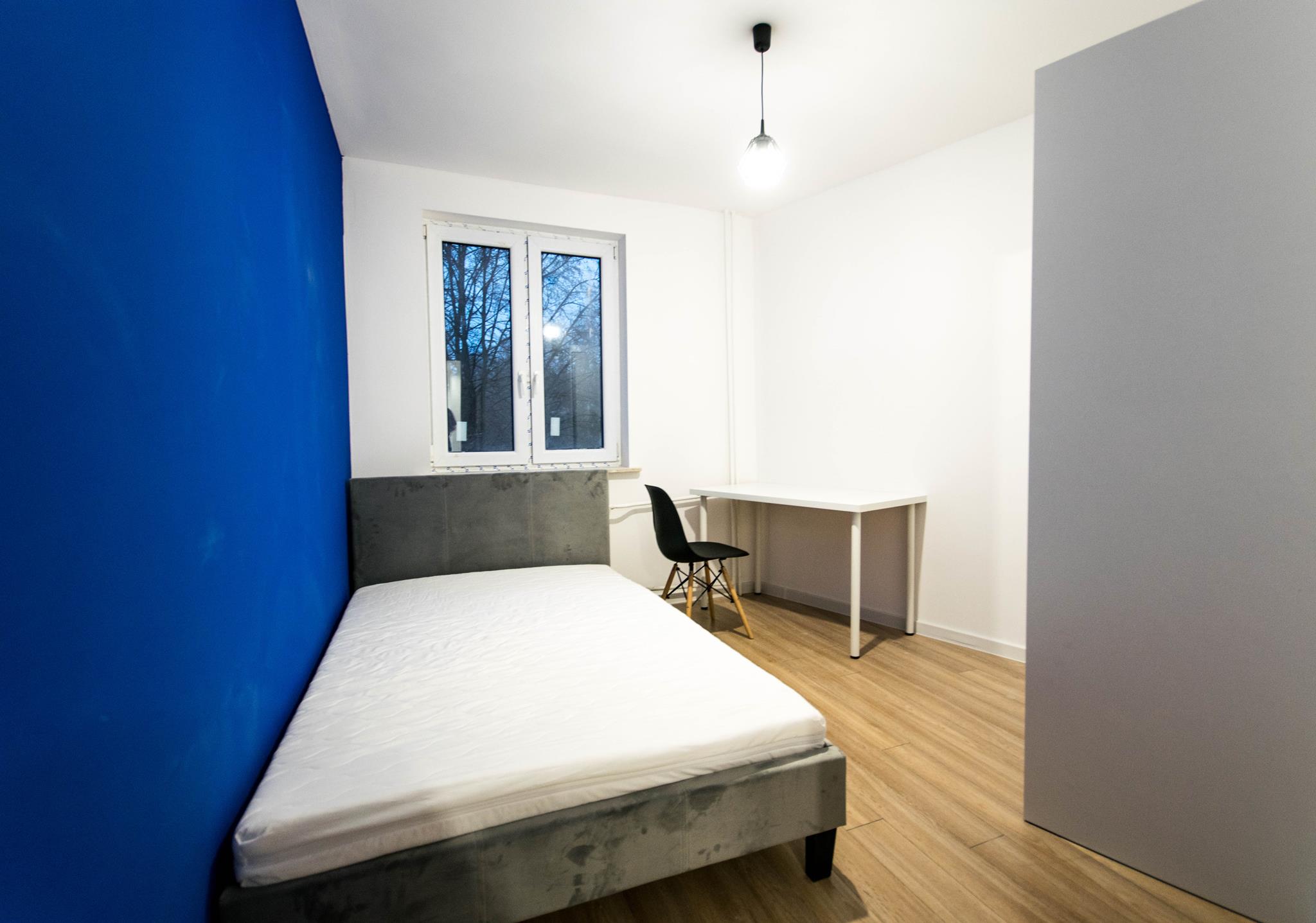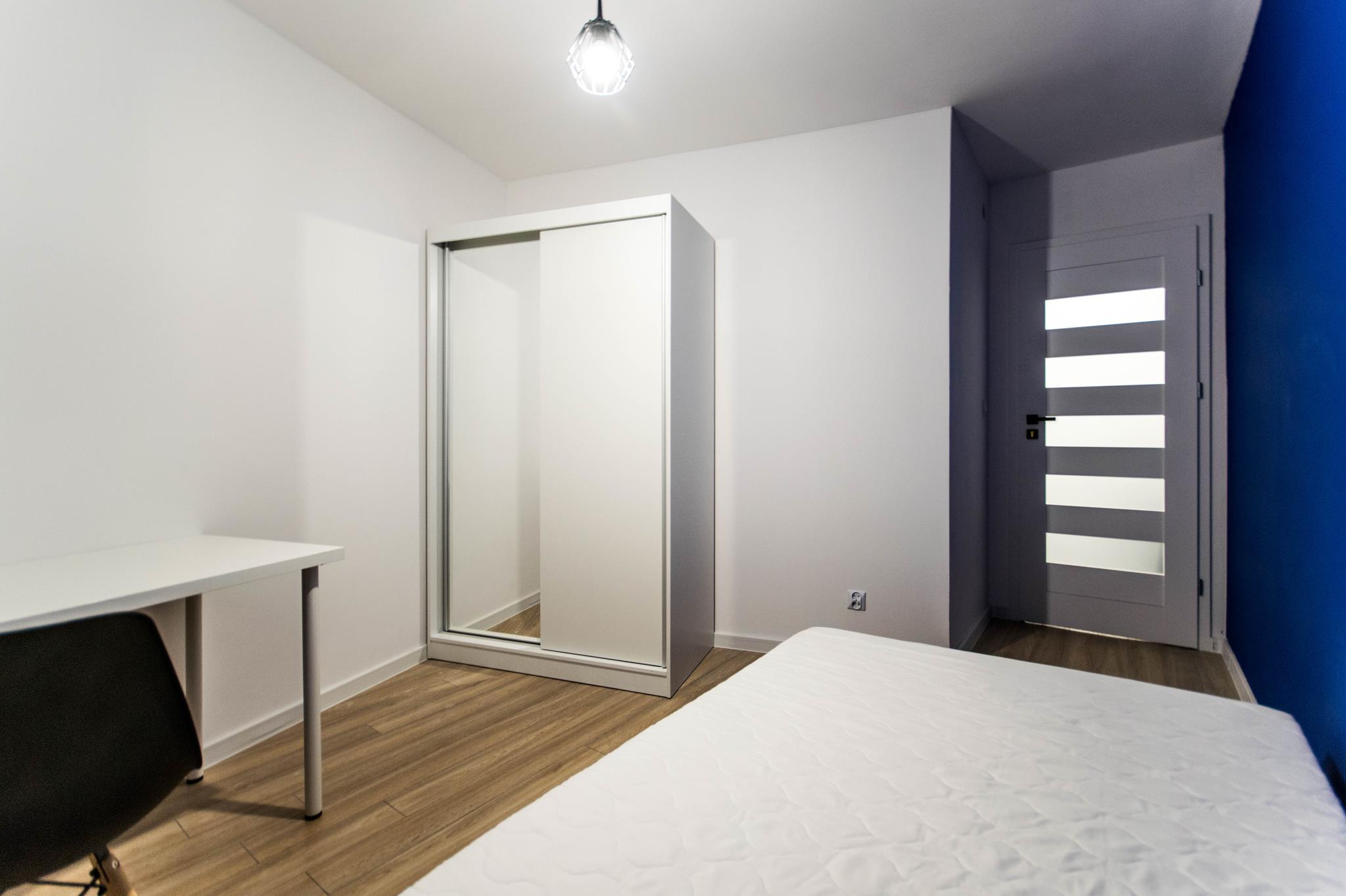 Do dyspozycji mamy 4 niezależne pokoje, w każdym z nich znajduje duża, wysoka, pojemna szafa z lustrem, w której można spokojnie zmieścić wszystkie swoje rzeczy, duże, wygodne łóżko z materacem, biurka do pracy wraz z krzesłami.