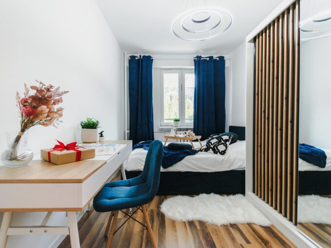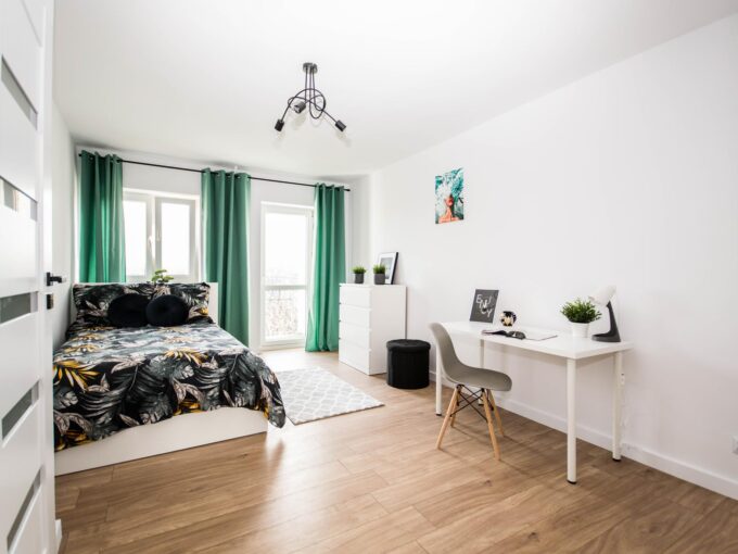 Do dyspozycji mamy 2 niezależne pokoje, w każdym z nich znajduje duża, pojemna szafa, w której można spokojnie zmieścić wszystkie swoje rzeczy, duże łóżko z materacem, biurko do pracy wraz z krzesłem.