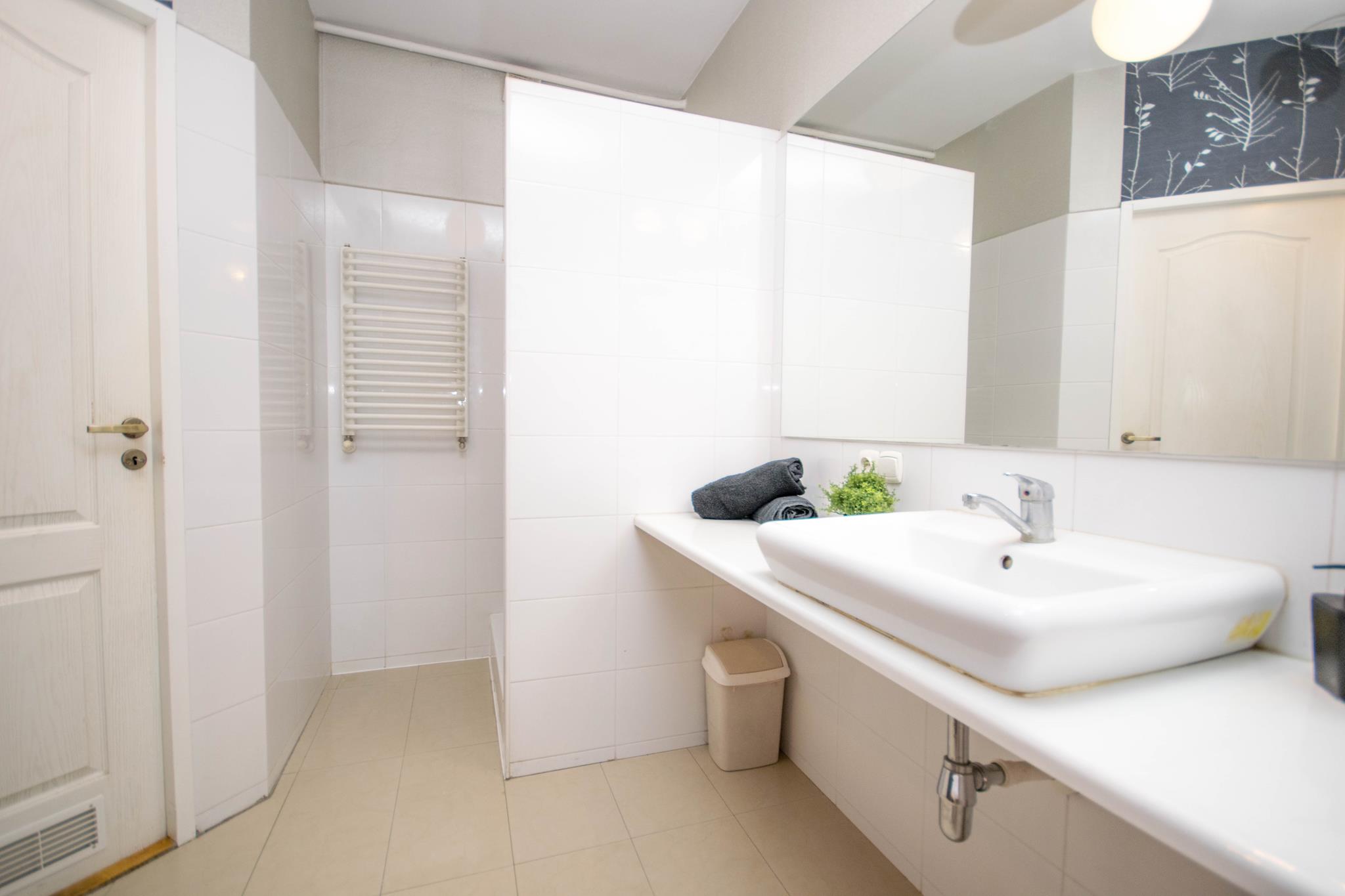 Przestronna łazienka z prysznicem, nowoczesną umywalką, dużym blatem i lustrem, jak również pralką.