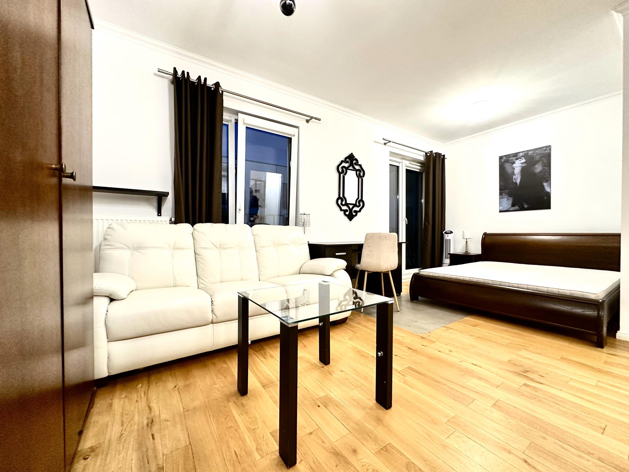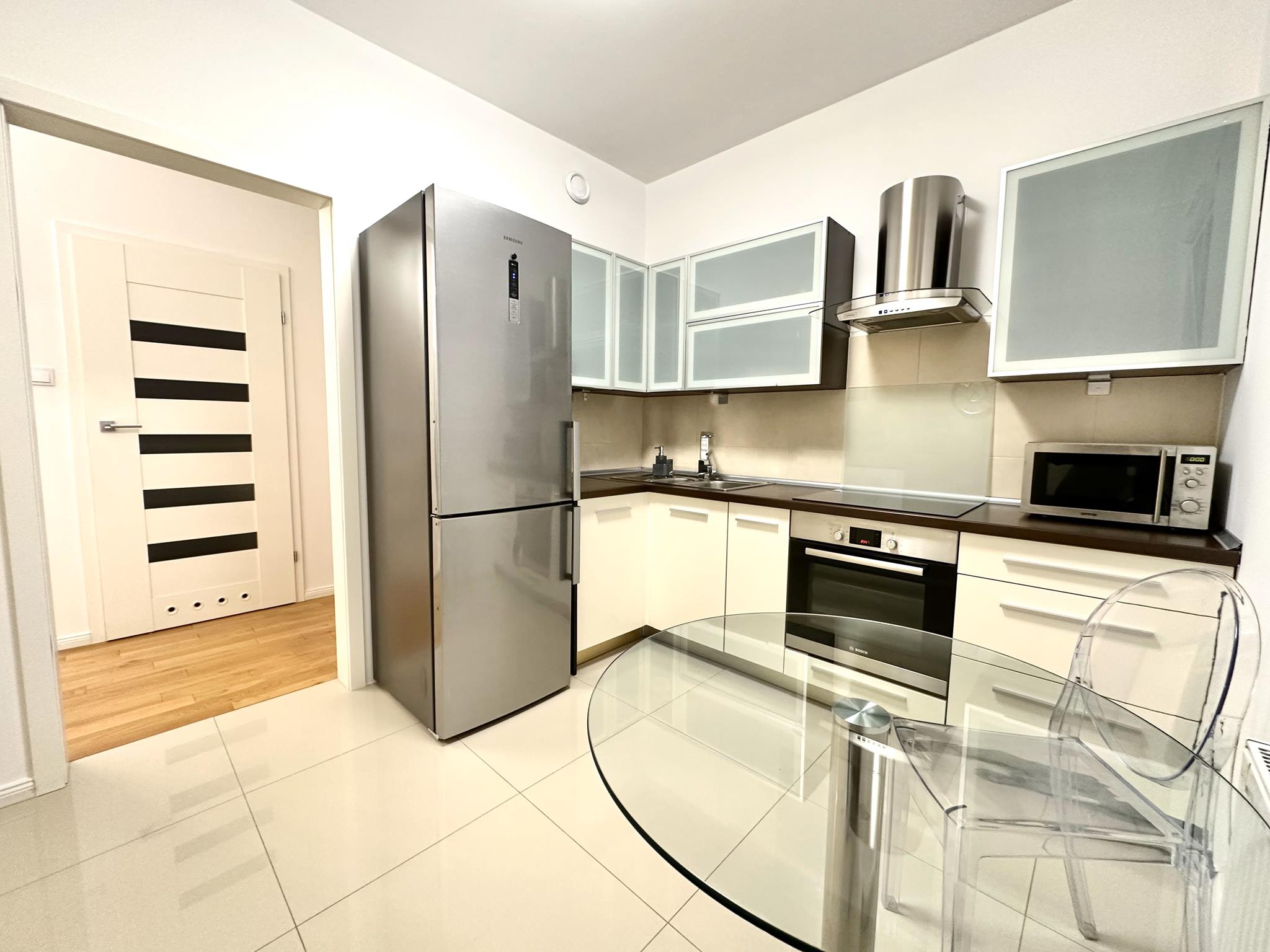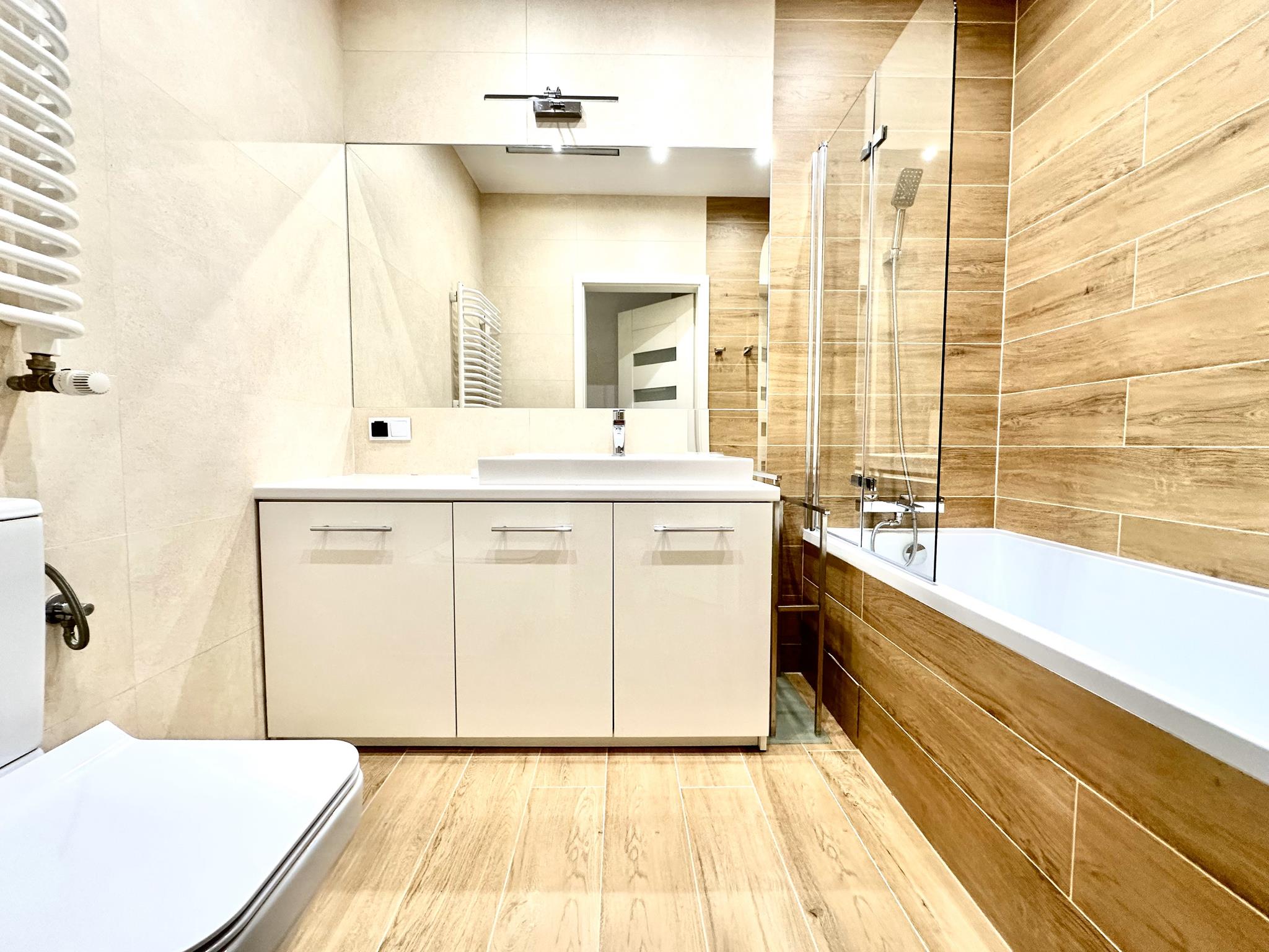 Łazienka z dużą wanną wraz z parawanem nawannowym, nowoczesną umywalką, dużym blatem i lustrem oraz sporą ilością miejsca do przechowywania.Do dyspozycji Najemcy również oddzielne pomieszczenie, w którym znajduje się pralka oraz suszarka.
