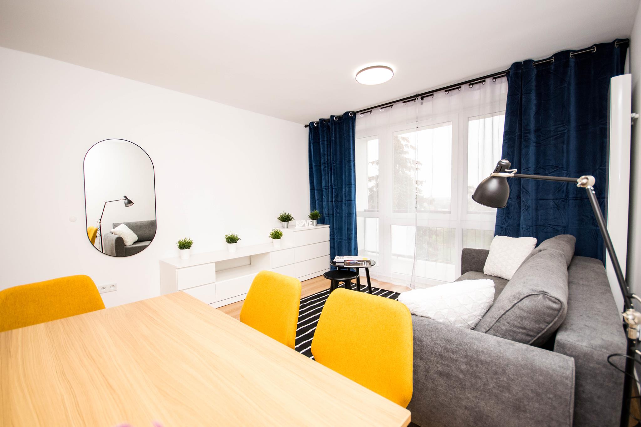 Do dyspozycji mamy 3 niezależne pokoje, w każdym z nich znajduje duża, wysoka, pojemna szafa w zabudowie, w której można spokojnie zmieścić wszystkie swoje rzeczy, duże łóżko tapicerowane z materacem/wygodna, rozkładana sofa oraz miejsce idealne do pracy czy nauki.
