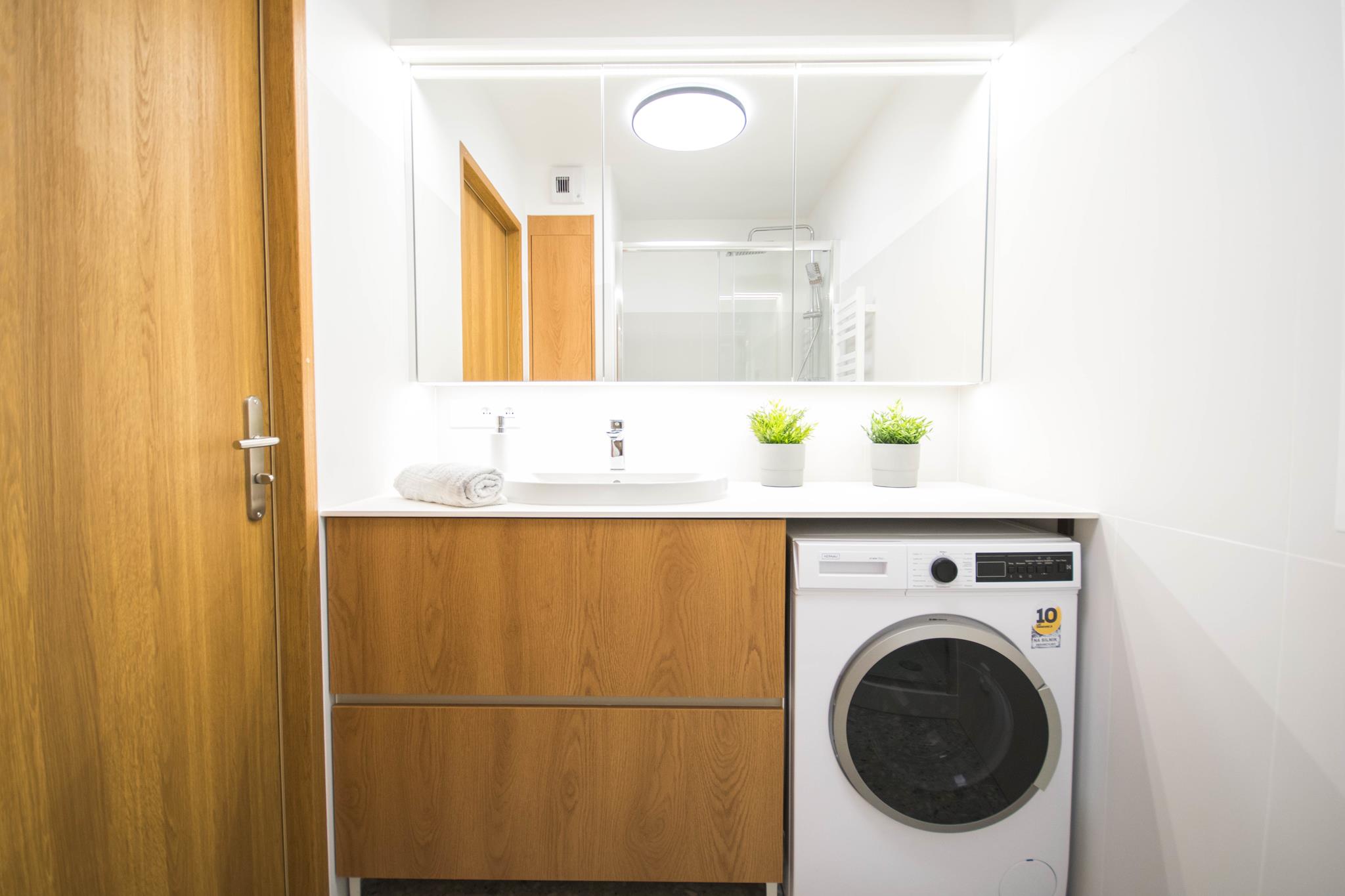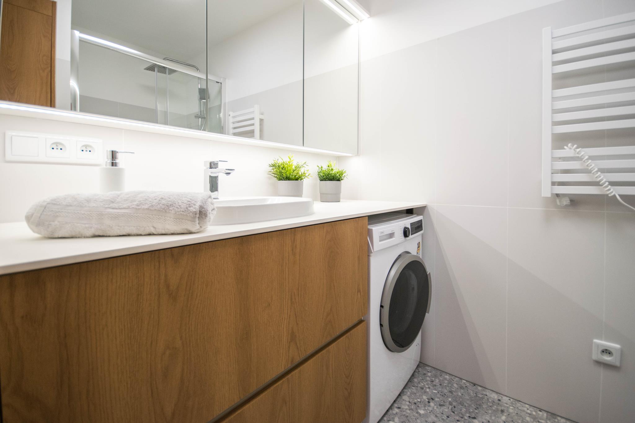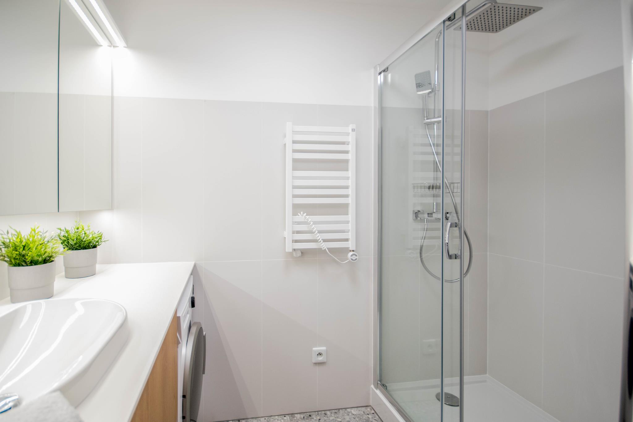 Łazienka z dużym prysznicem, nowoczesną umywalką, dużym blatem, szafkami z miejscem do przechowywania, jak również pralką oraz oddzielne WC z umywalką.