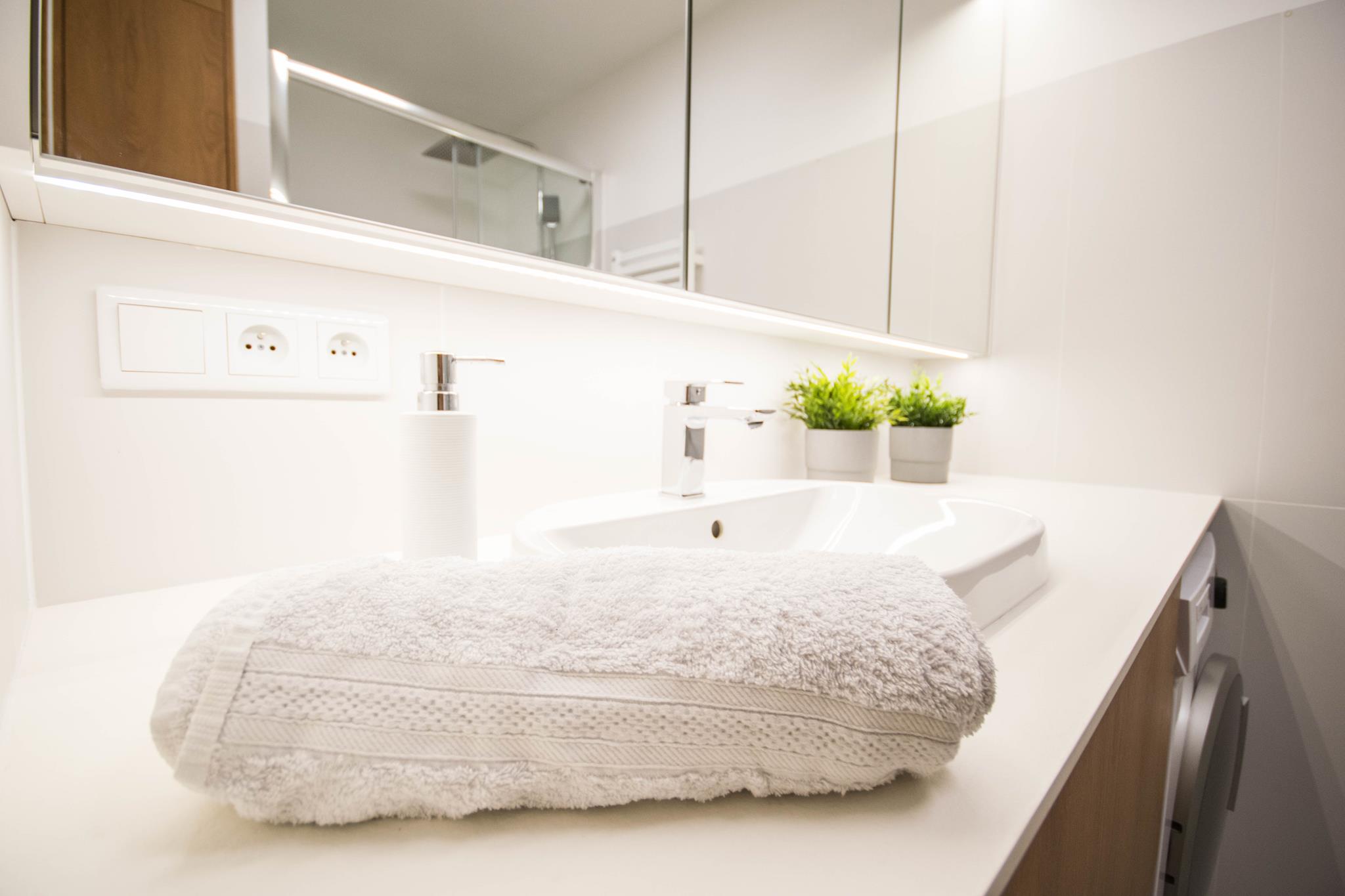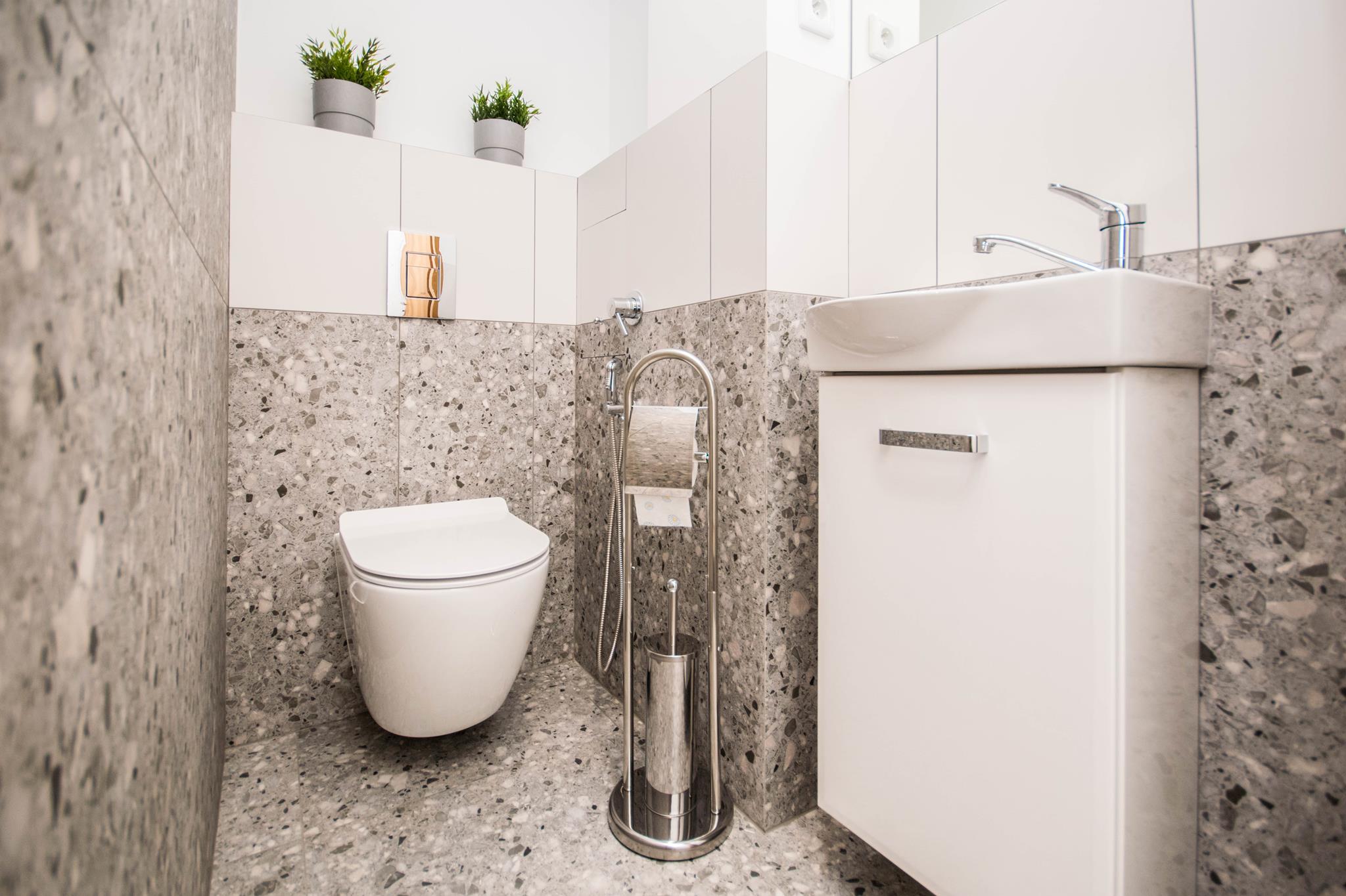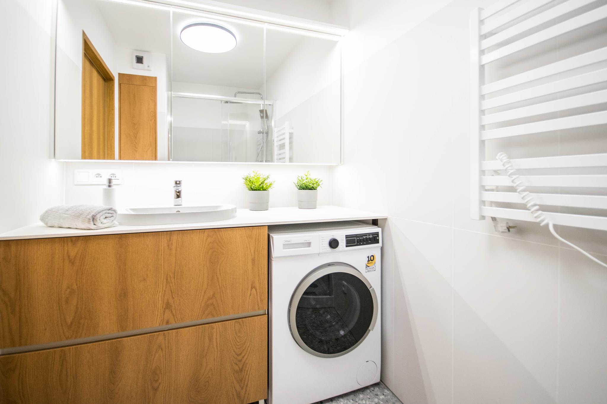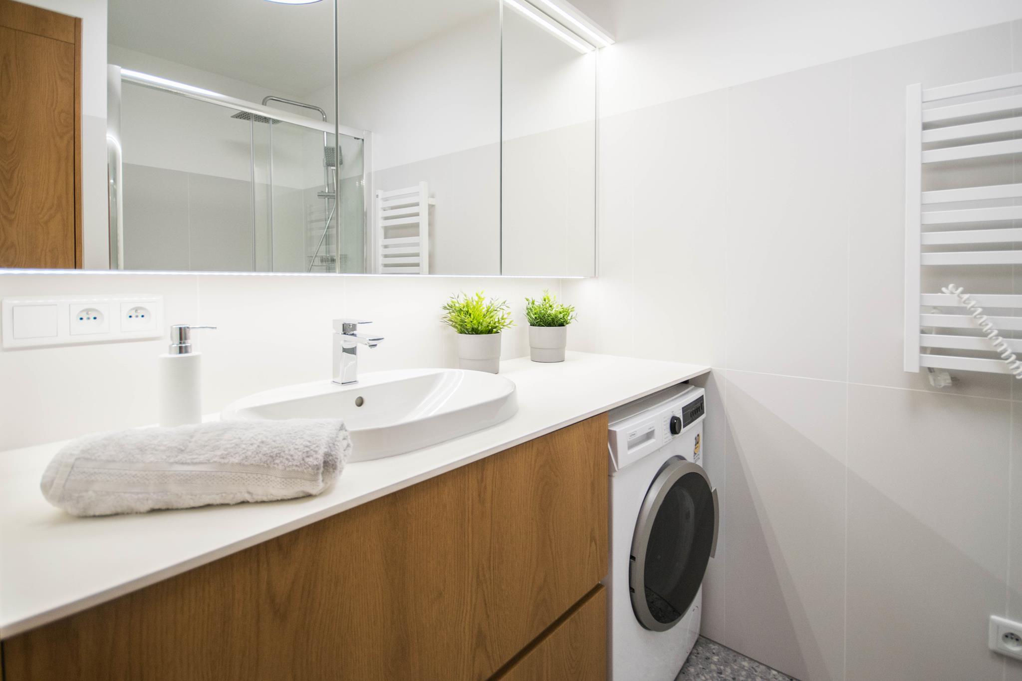 Łazienka z dużym prysznicem, nowoczesną umywalką, dużym blatem, szafkami z miejscem do przechowywania, jak również pralką oraz oddzielne WC z umywalką.