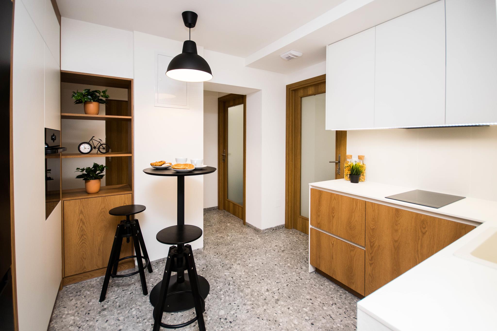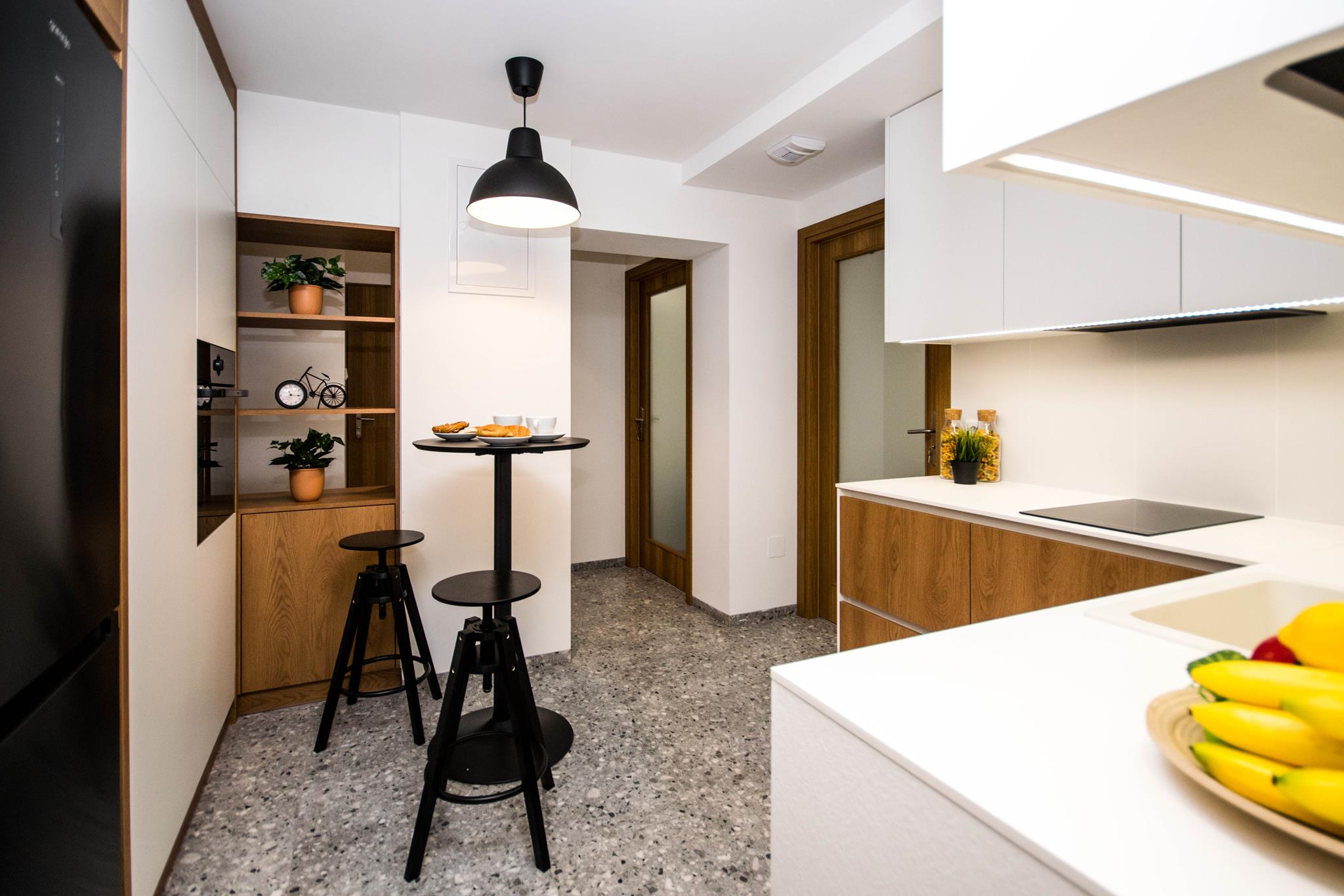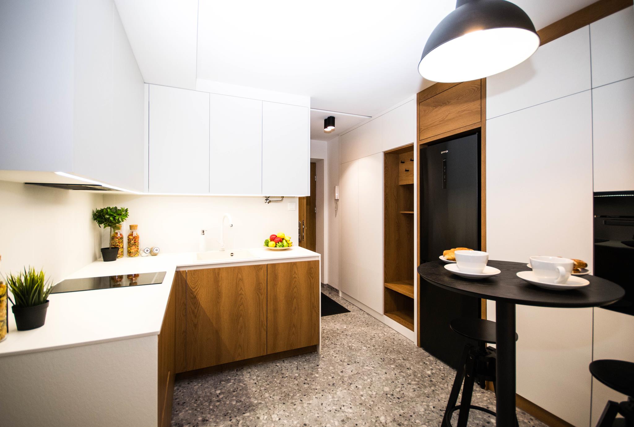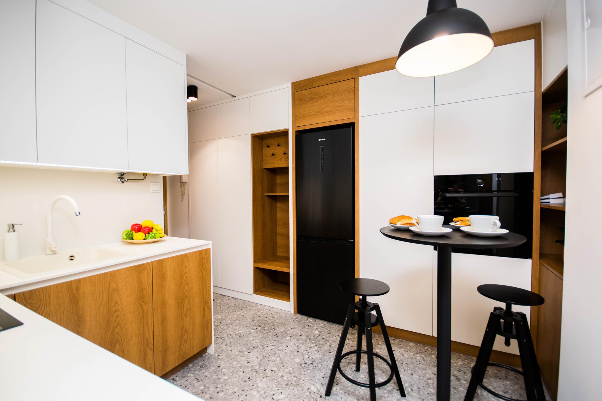 🍳 Duża kuchnia w zabudowie pod sam sufit, z pełnym wyposażeniem włącznie ze zmywarką oraz stolikiem z krzesłami barowymi