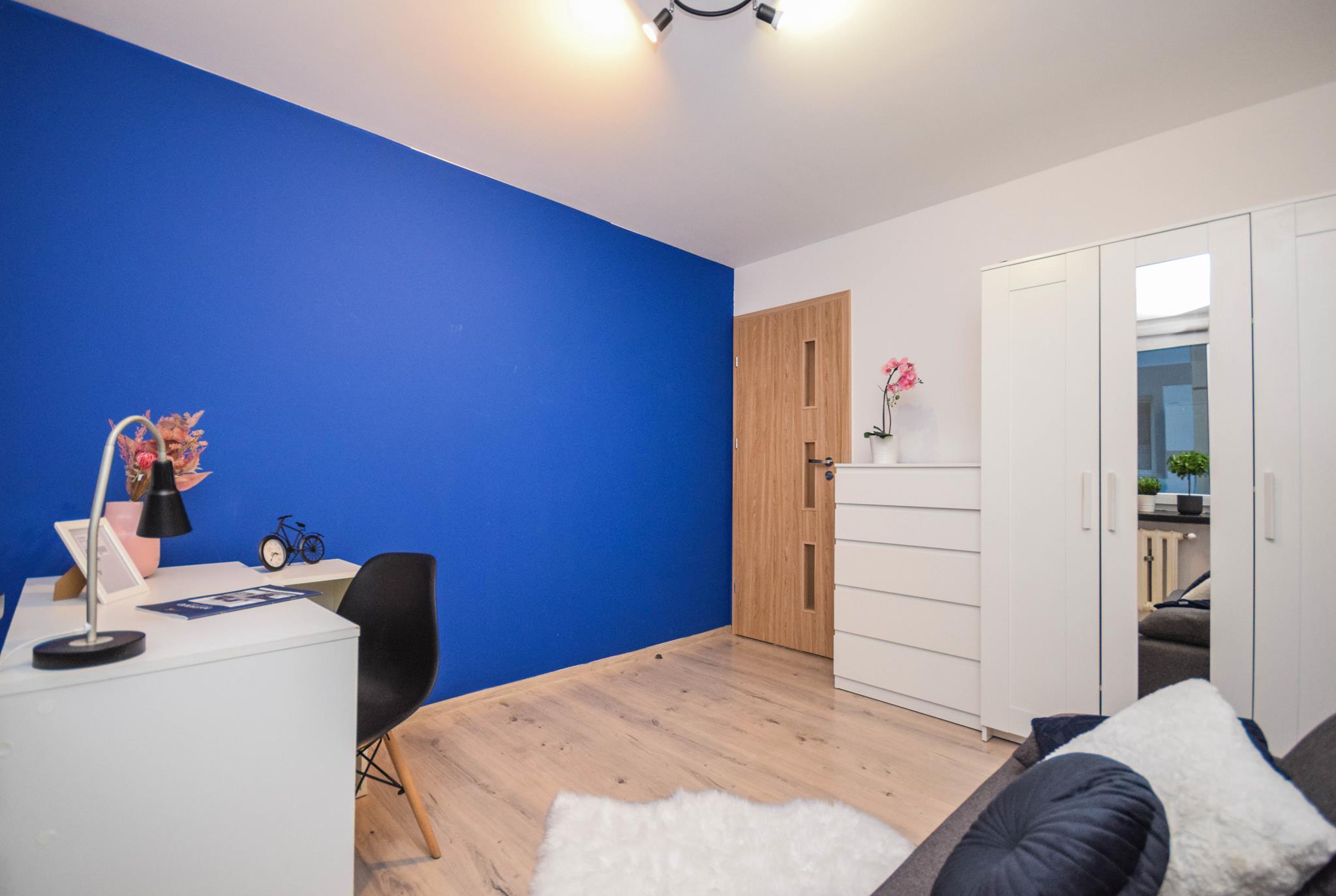Do dyspozycji mamy 2 niezależne pokój, w którym znajdują się duża, wysoka, pojemna szafa, w której można spokojnie zmieścić wszystkie swoje rzeczy, wygodne łóżko z materacem, biurko do pracy czy nauki wraz z krzesłem.