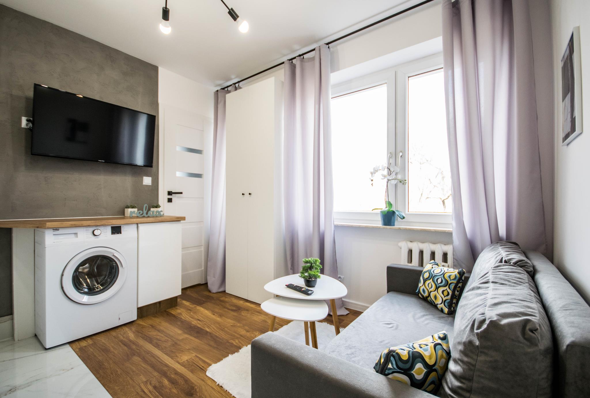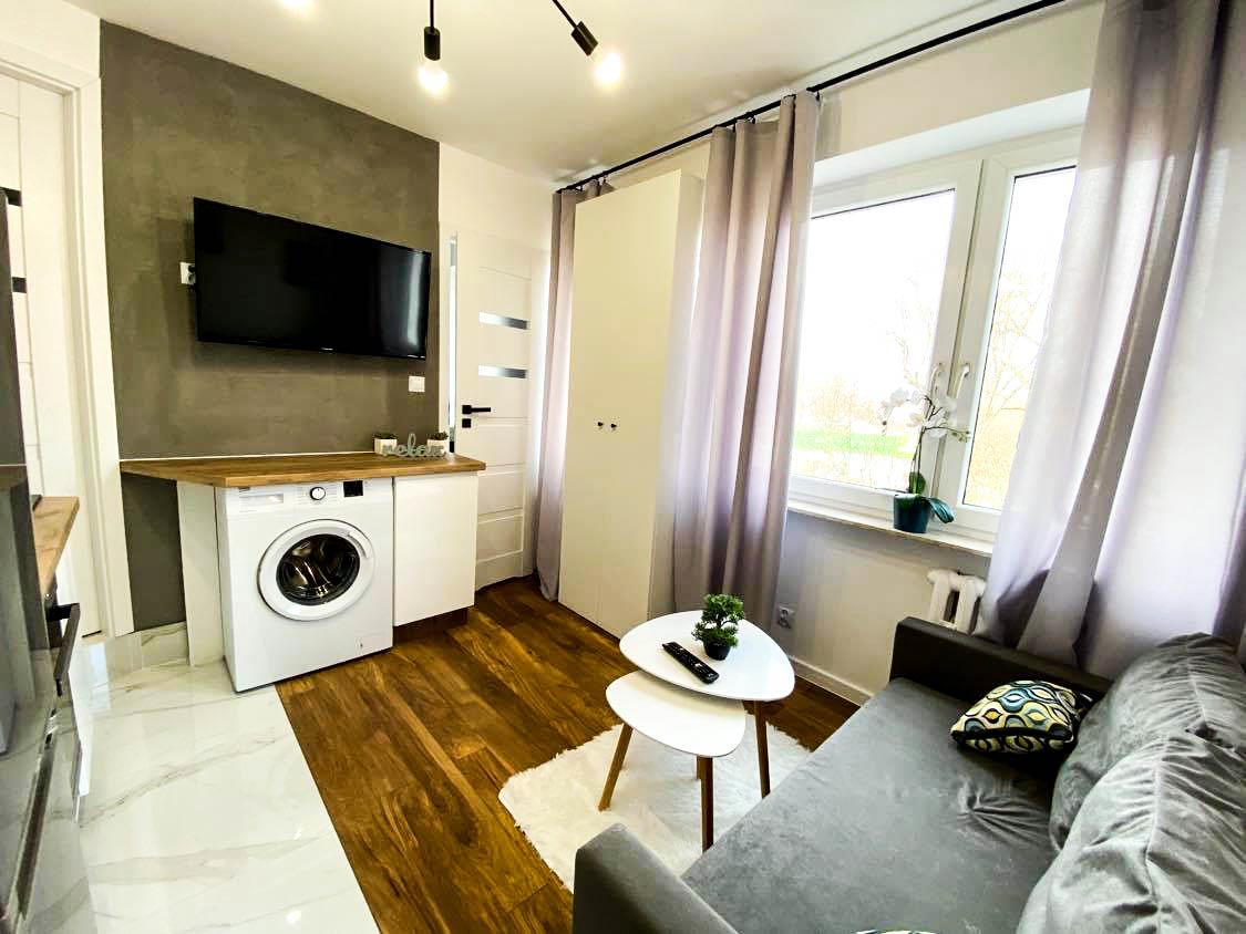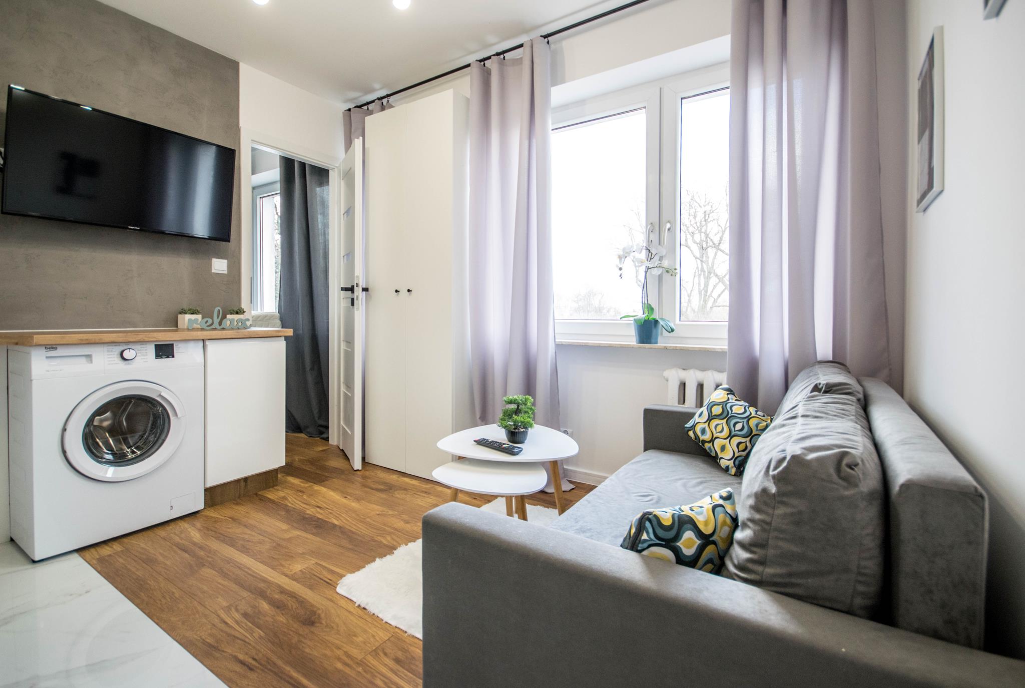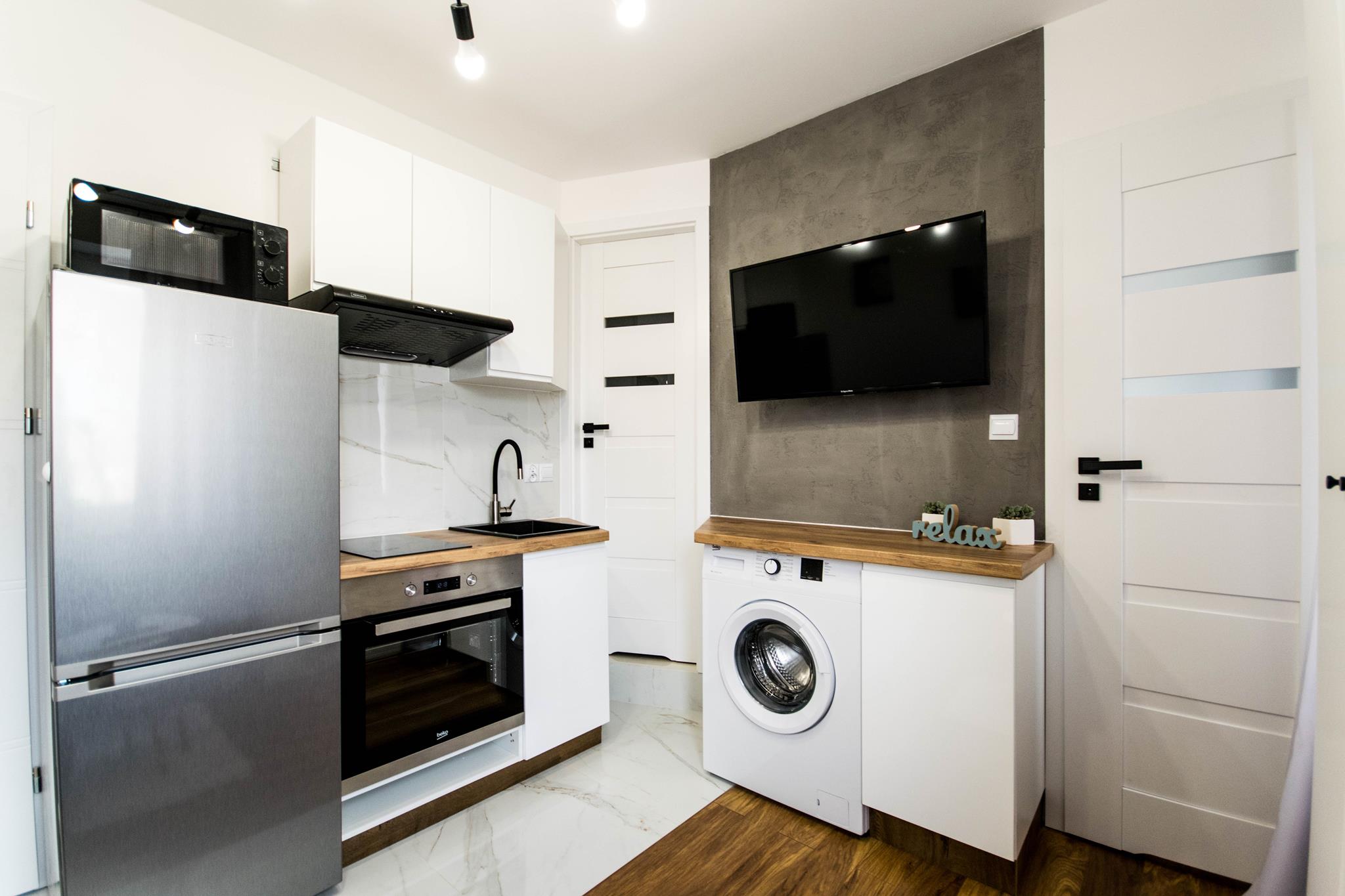 Mieszkanie, w którym znajdziesz salon z wygodną, rozkładaną sofą, stolikiem oraz pojemną szafę i TV z funkcją smart. Aneks kuchenny z pełnym wyposażeniem takim jak: