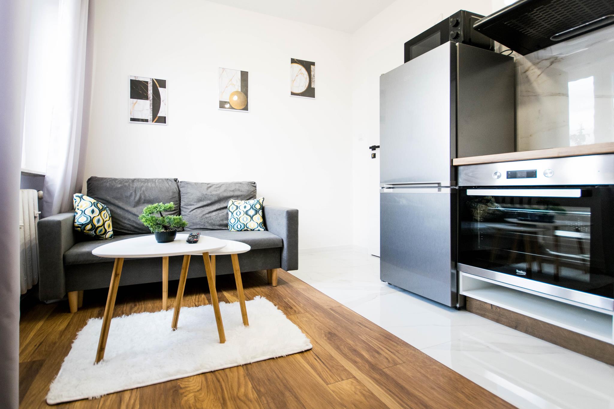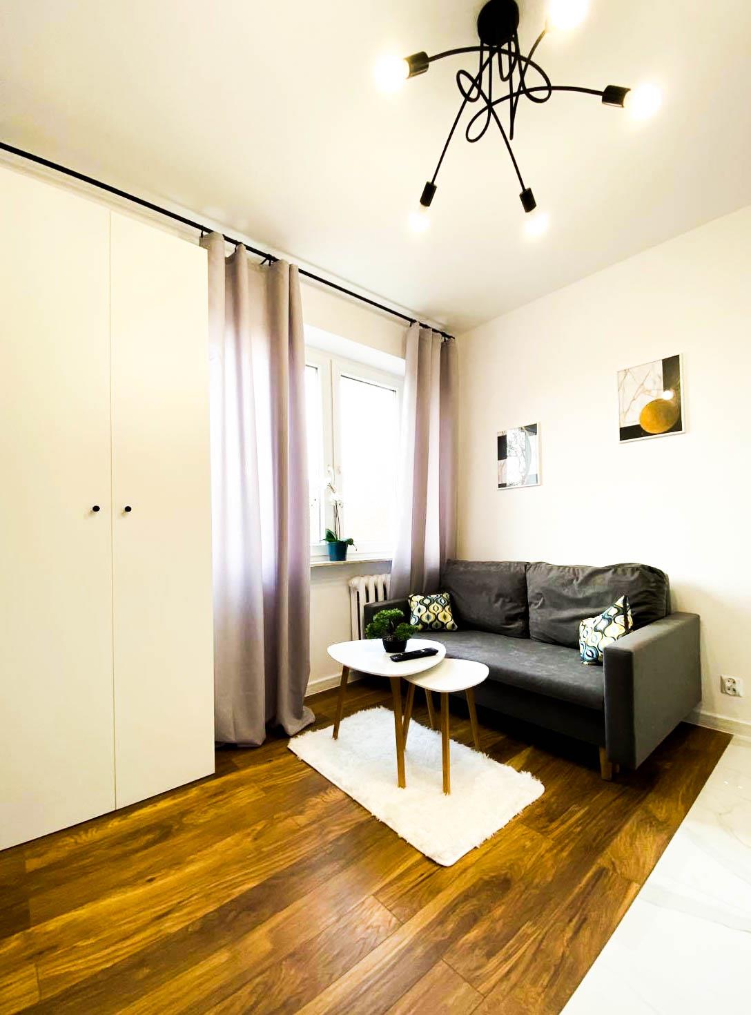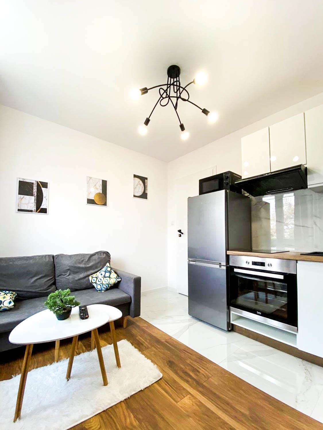 Mieszkanie, w którym znajdziesz salon z wygodną, rozkładaną sofą, stolikiem oraz pojemną szafę i TV z funkcją smart. Aneks kuchenny z pełnym wyposażeniem takim jak: