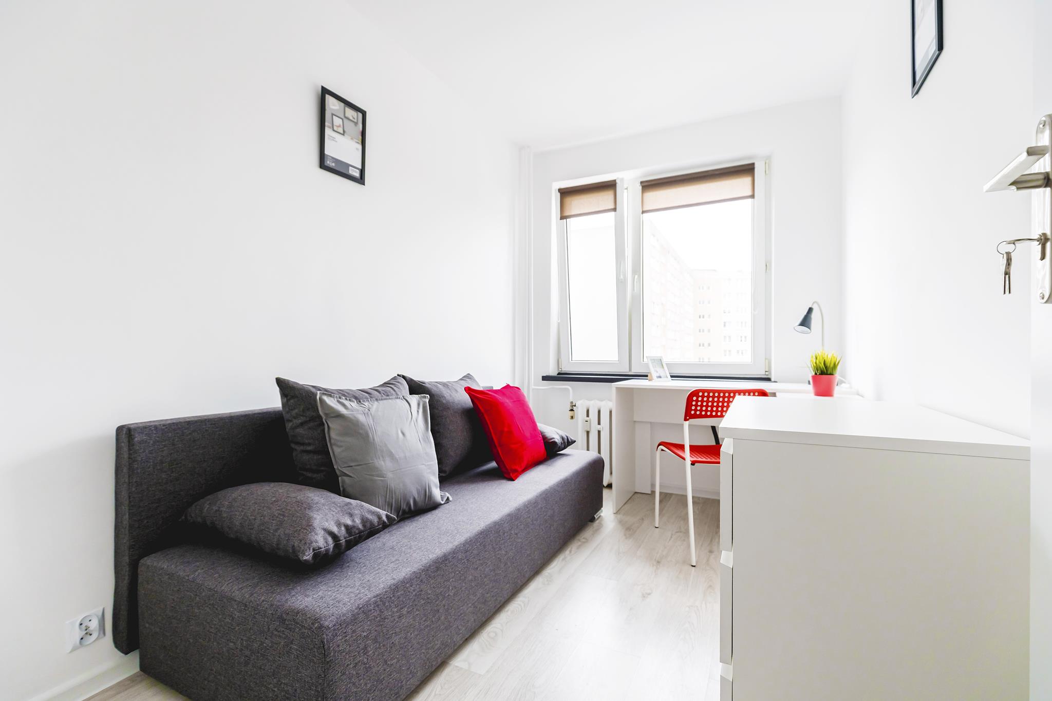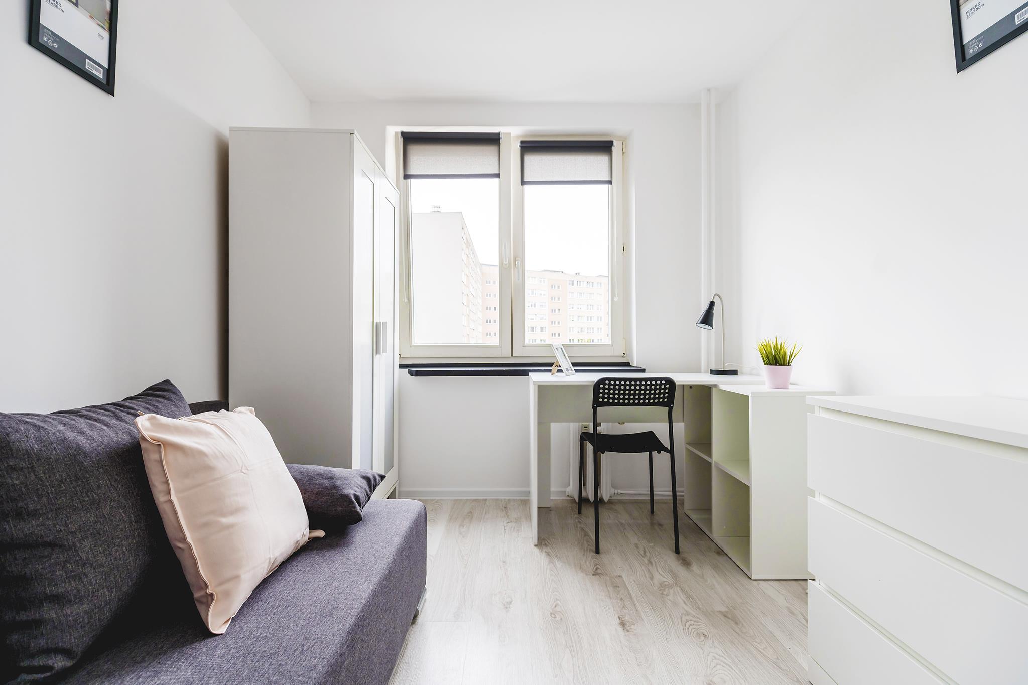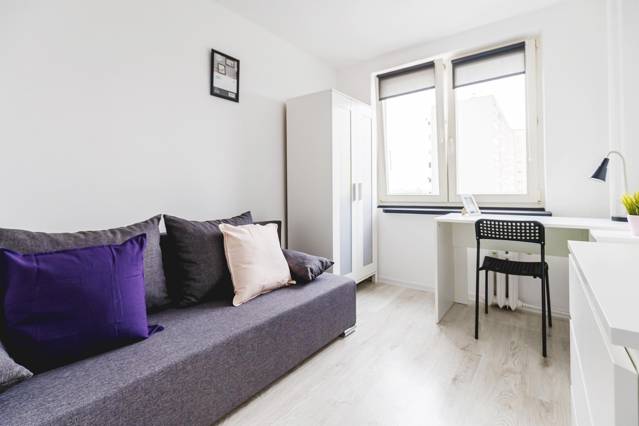 🛌 Pokoje z wygodnymi tapicerowanymi sofami, biurkami do nauki lub pracy i pojemną szafą