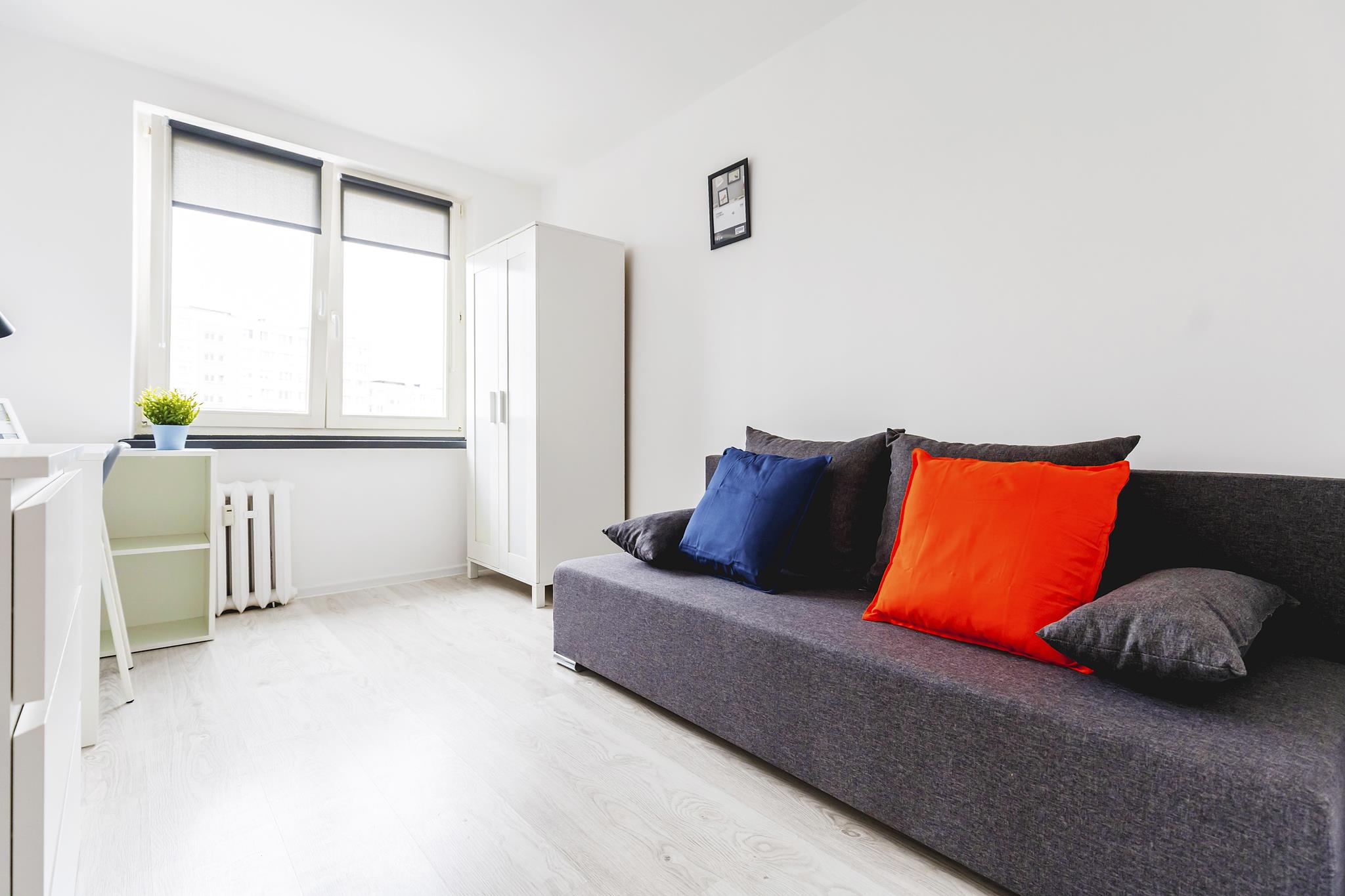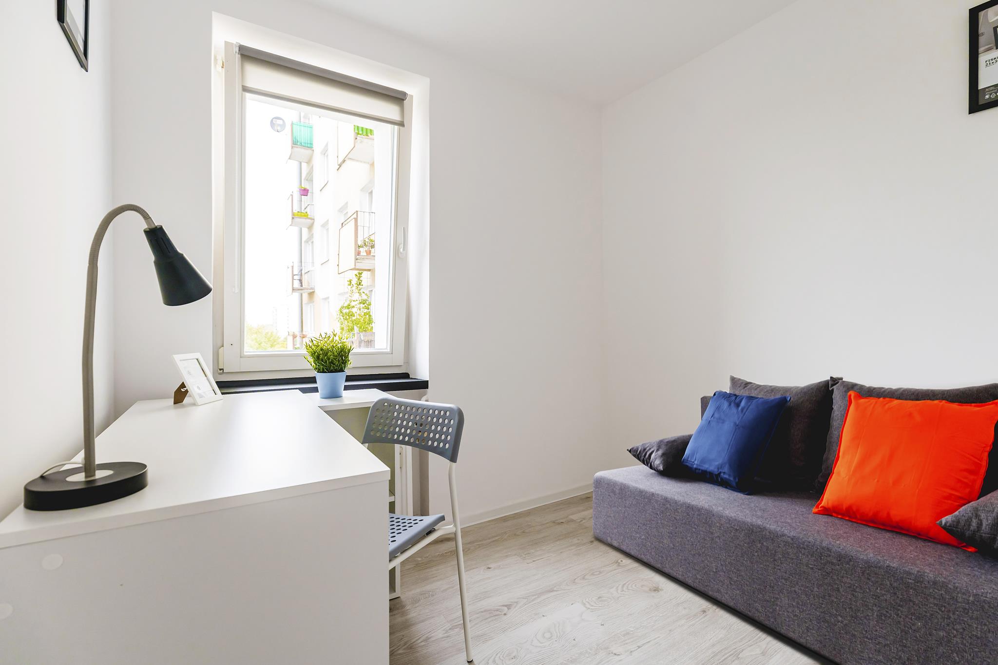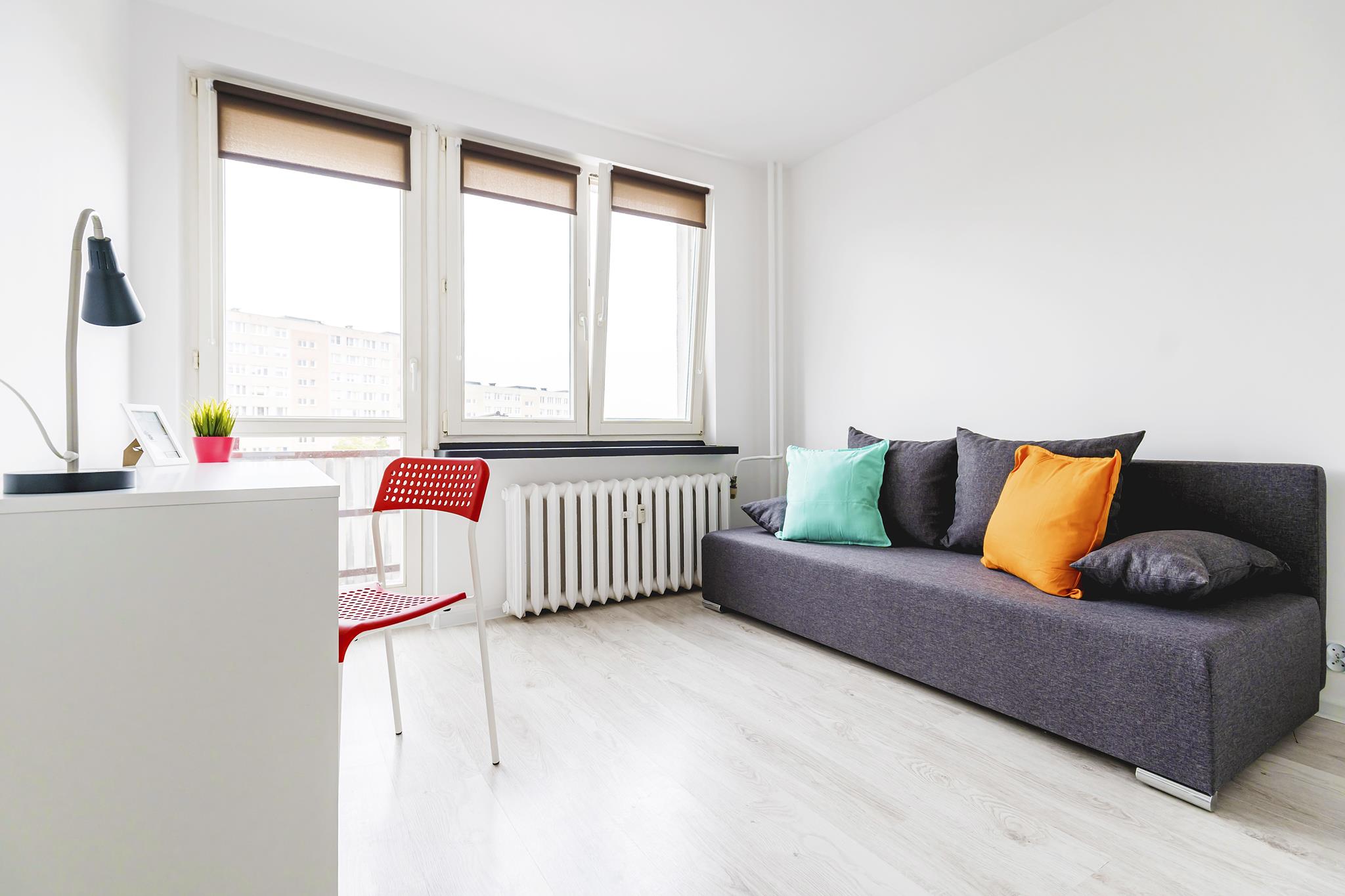 🛌 Pokoje z wygodnymi tapicerowanymi sofami, biurkami do nauki lub pracy i pojemną szafą