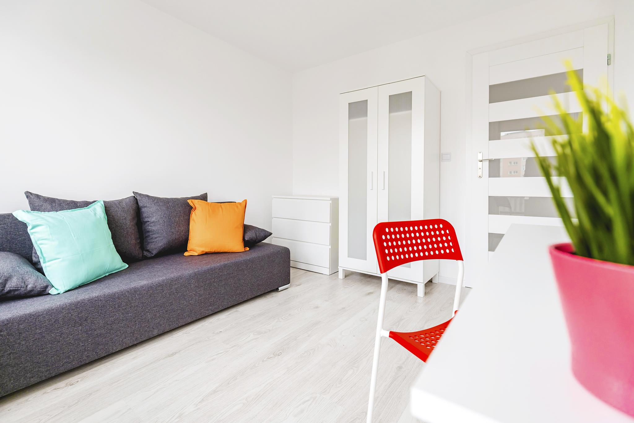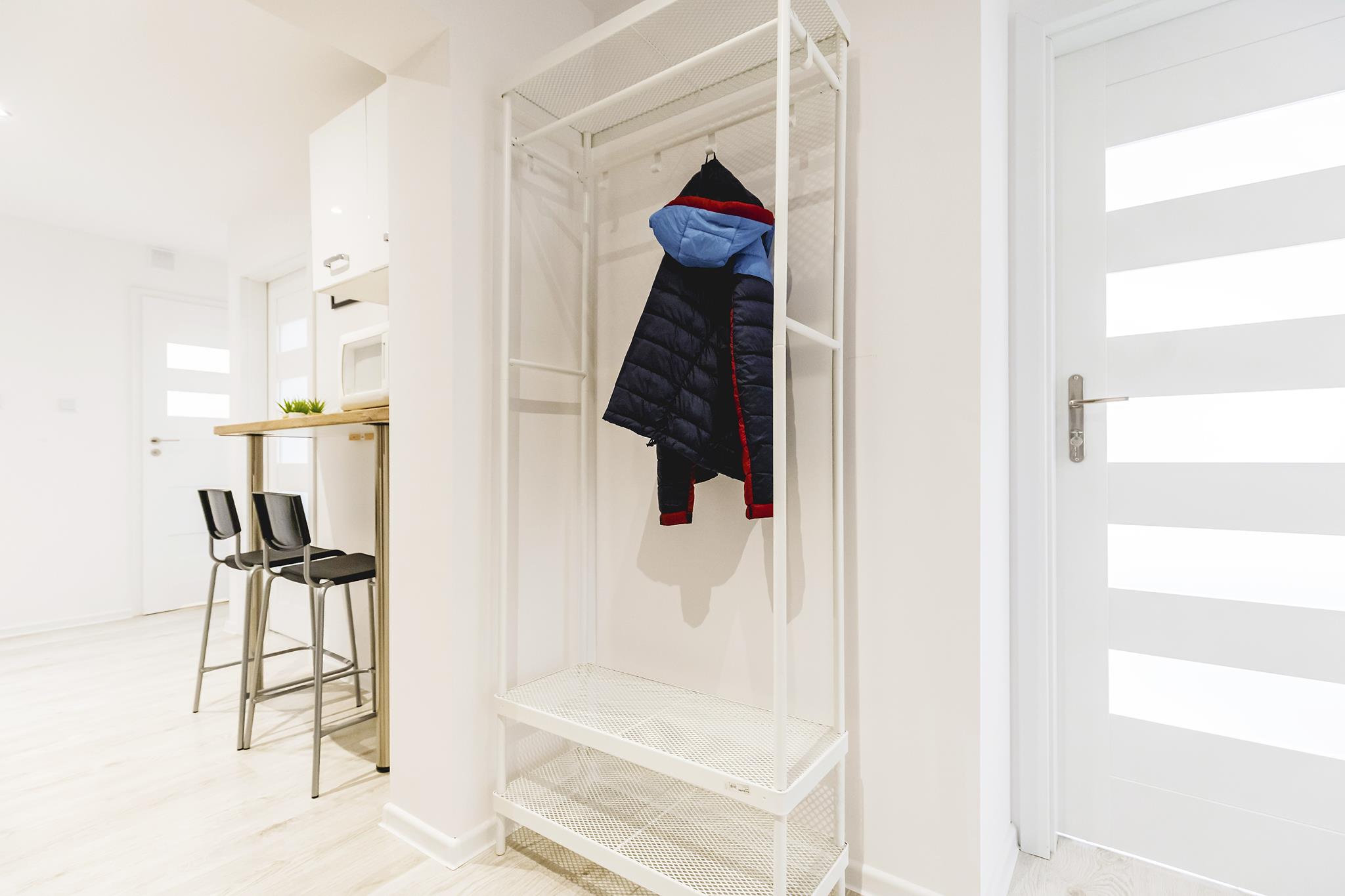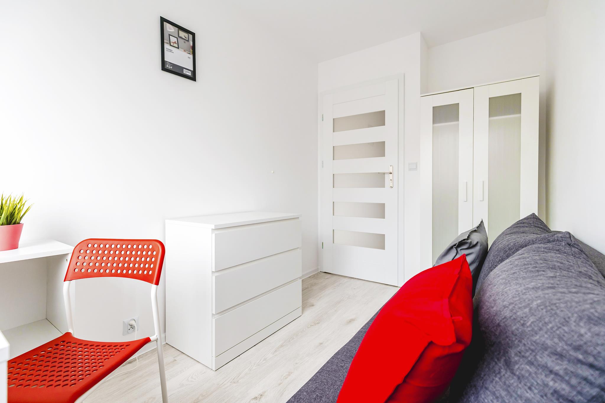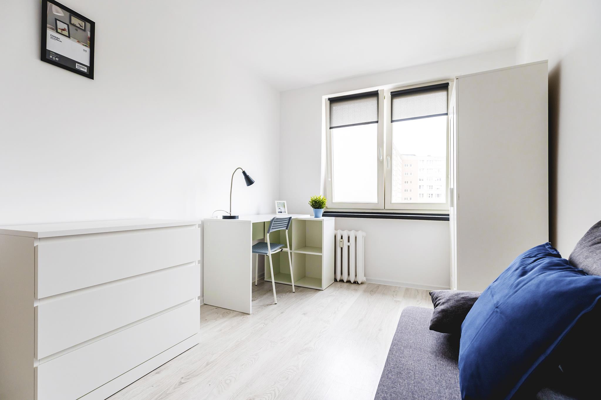 Do dyspozycji mamy 5 niezależnych pokoi, w każdym z nich znajduje się szafa, w której można spokojnie zmieścić wszystkie swoje rzeczy, duża wygodna sofa tapicerowana, biurka do pracy wraz z krzesłami.