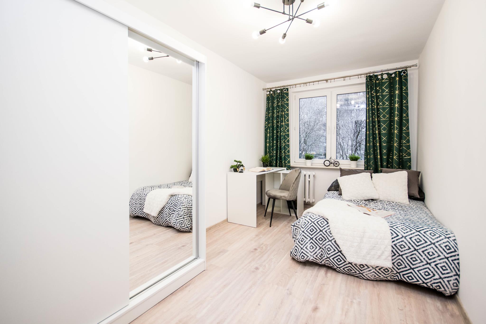 W mieszkaniu znajdują się 2 niezależne pokoje, w każdym z nich znajduje duża, wysoka, pojemna szafa, w której można spokojnie zmieścić wszystkie swoje rzeczy, duże łóżko materacem, biurko do pracy wraz z krzesłem idealne do pracy czy nauki.