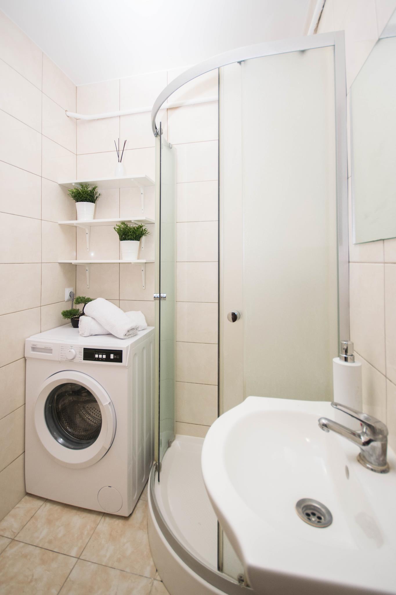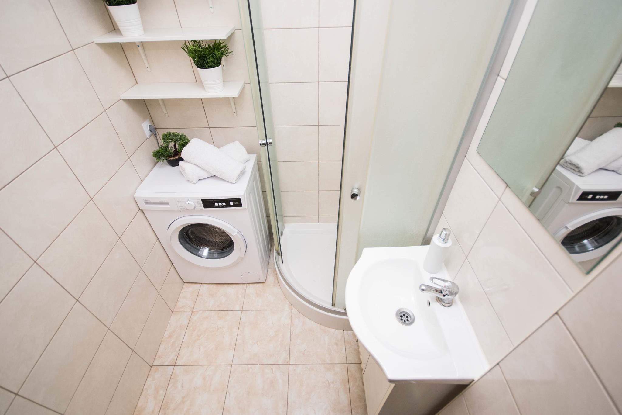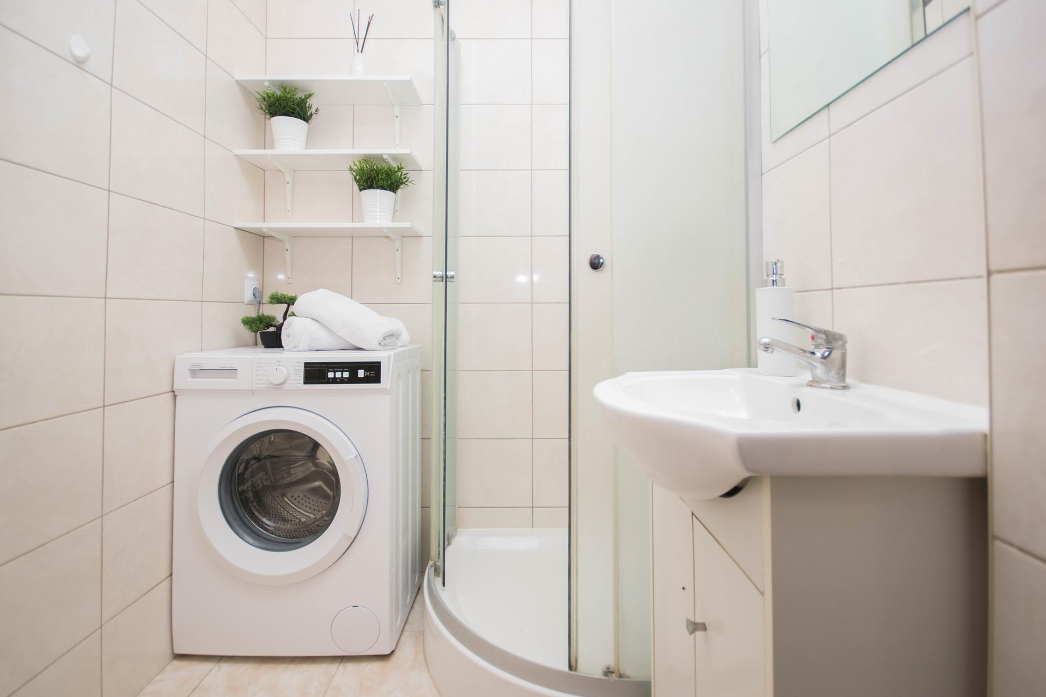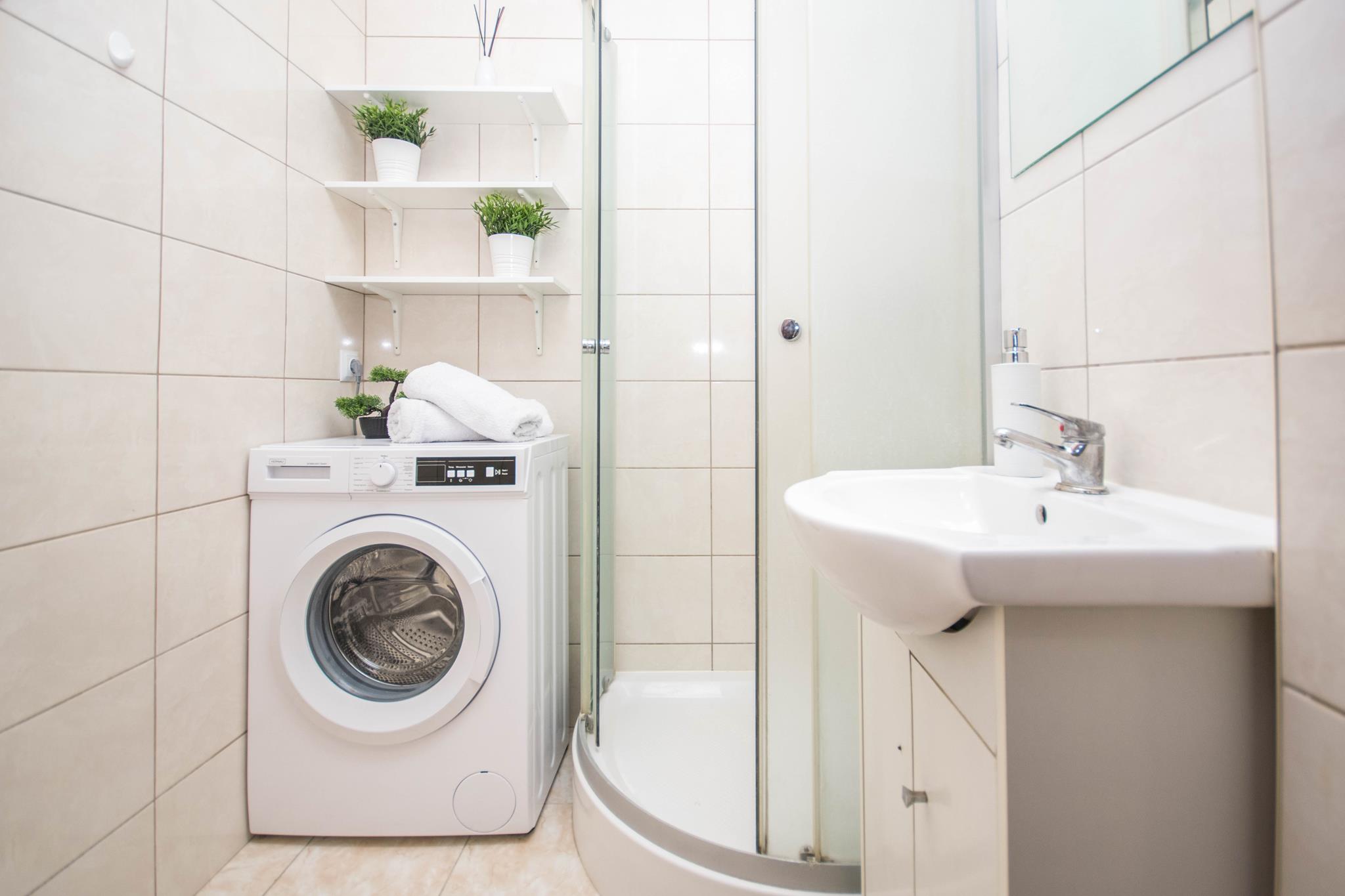 Łazienka z prysznicem, umywalką i lustrem, szafkami z miejscem do przechowywania, jak również pralką oraz oddzielne WC.