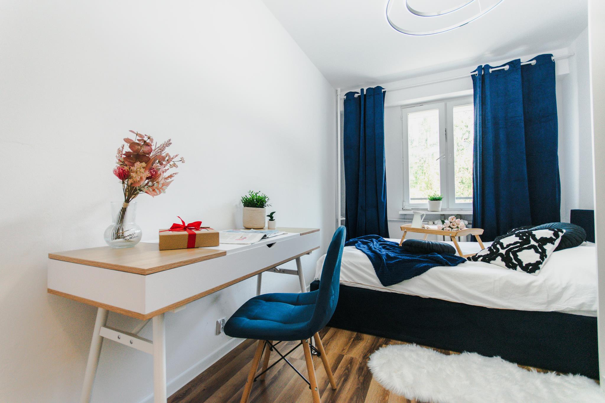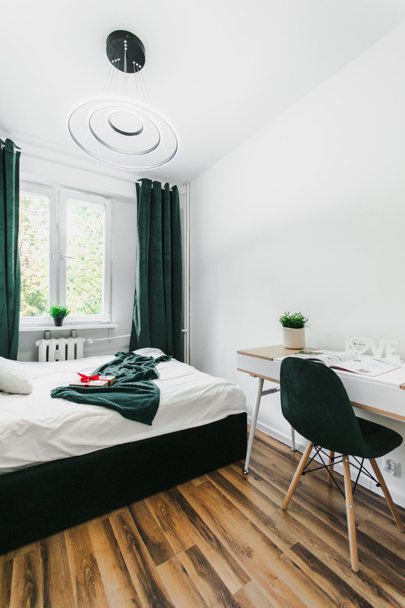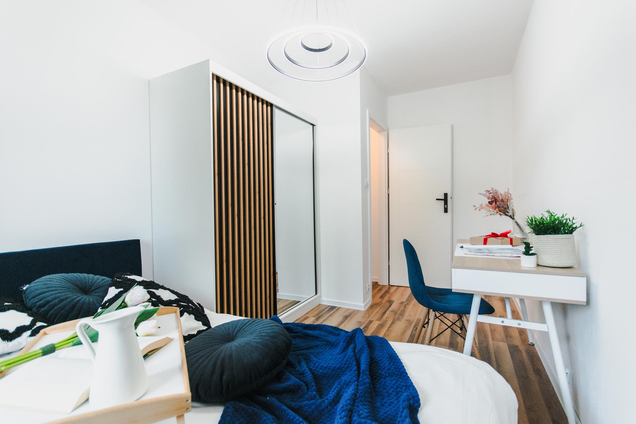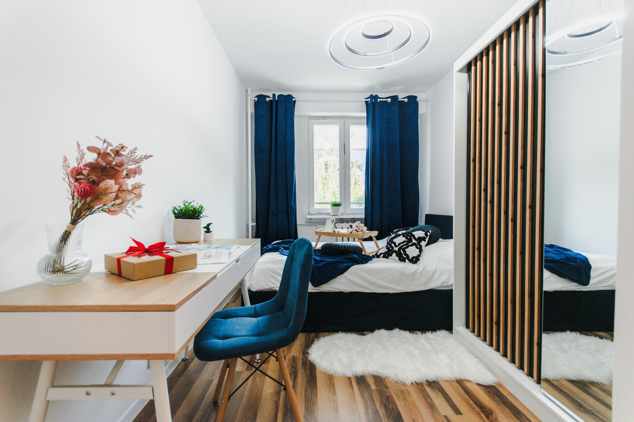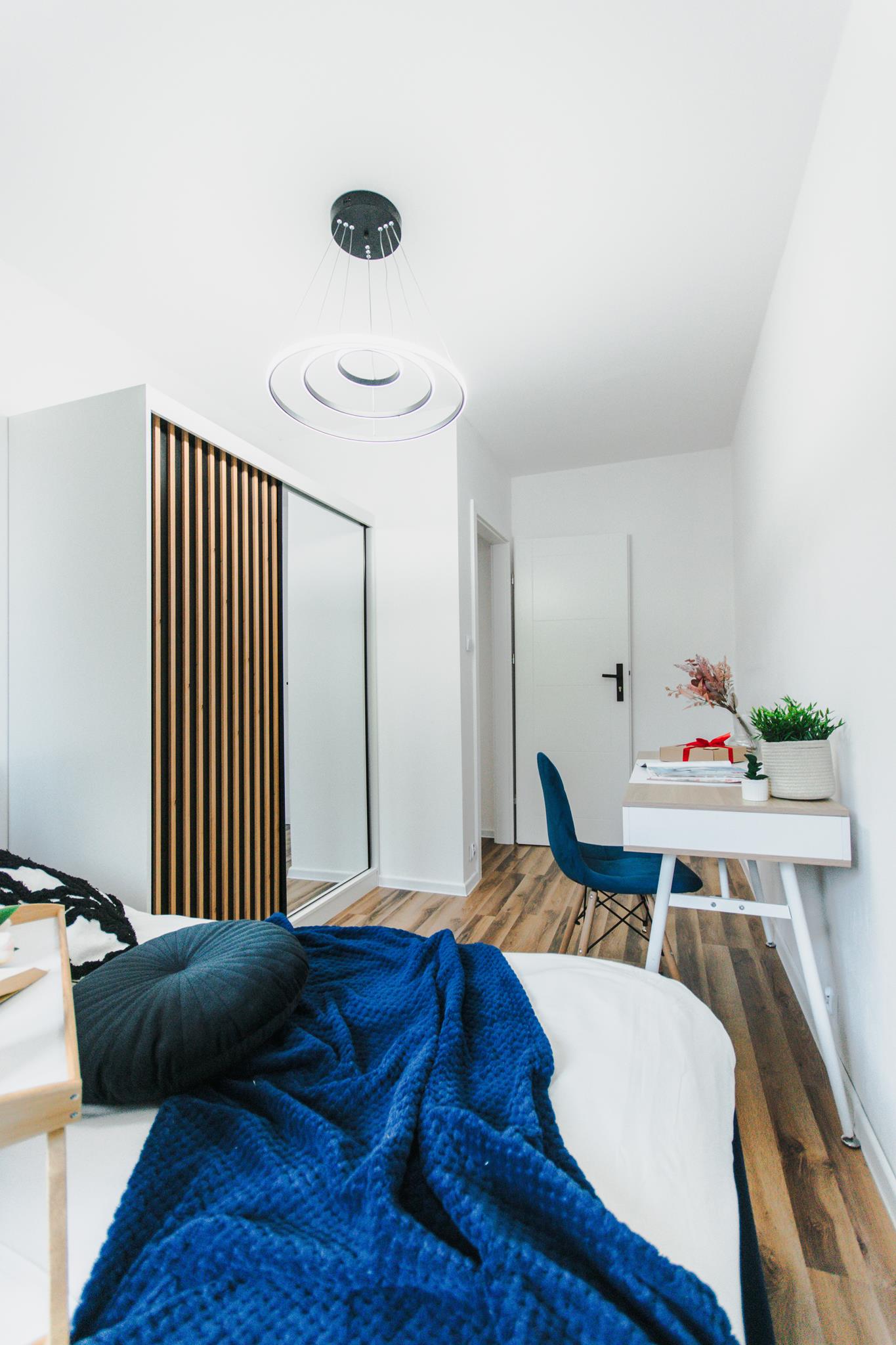 🛌 Trzy niezależne pokoje, każdy wyposażony w wygodne łóżko, pojemną szafę z lustrem oraz biurko z krzesłem do pracy lub nauki