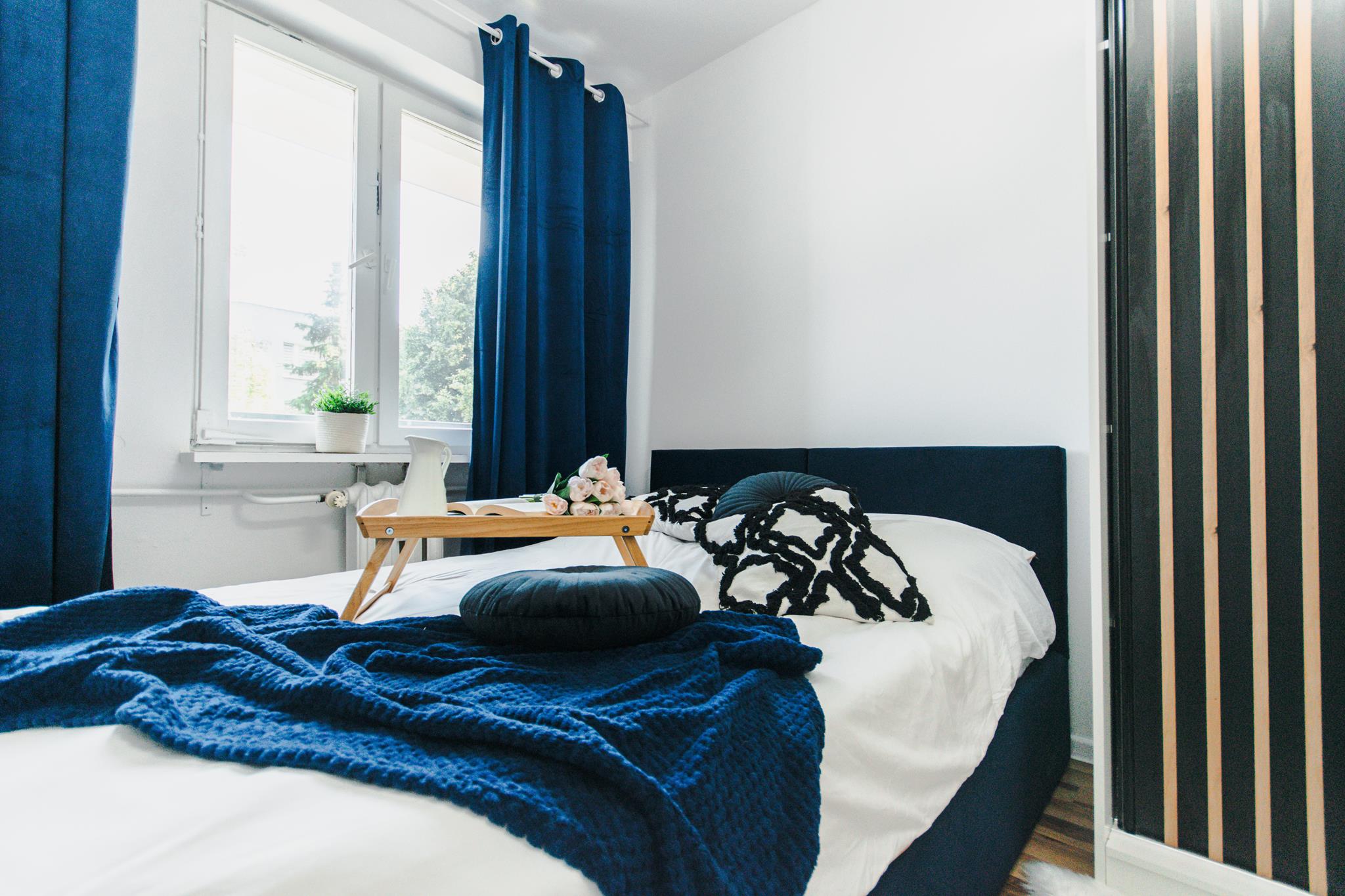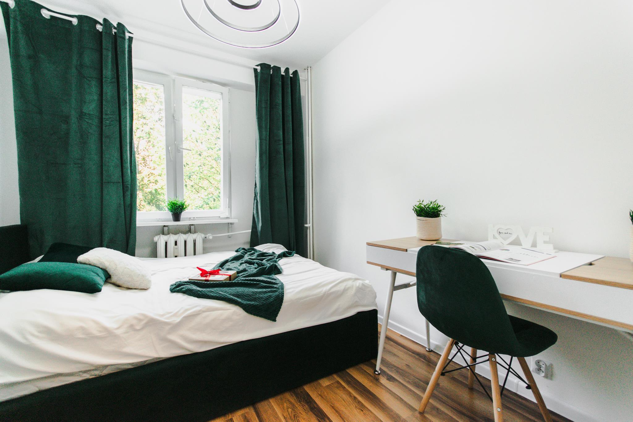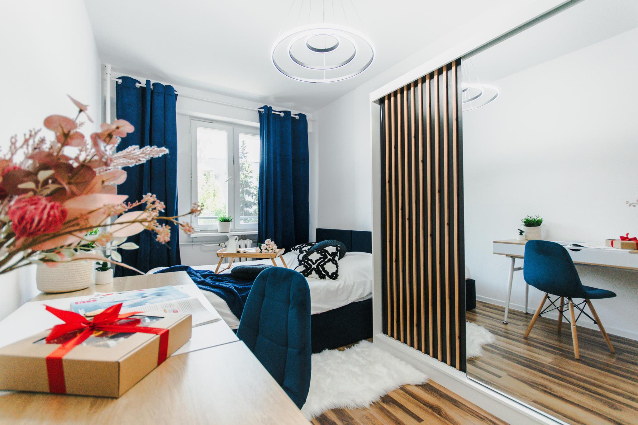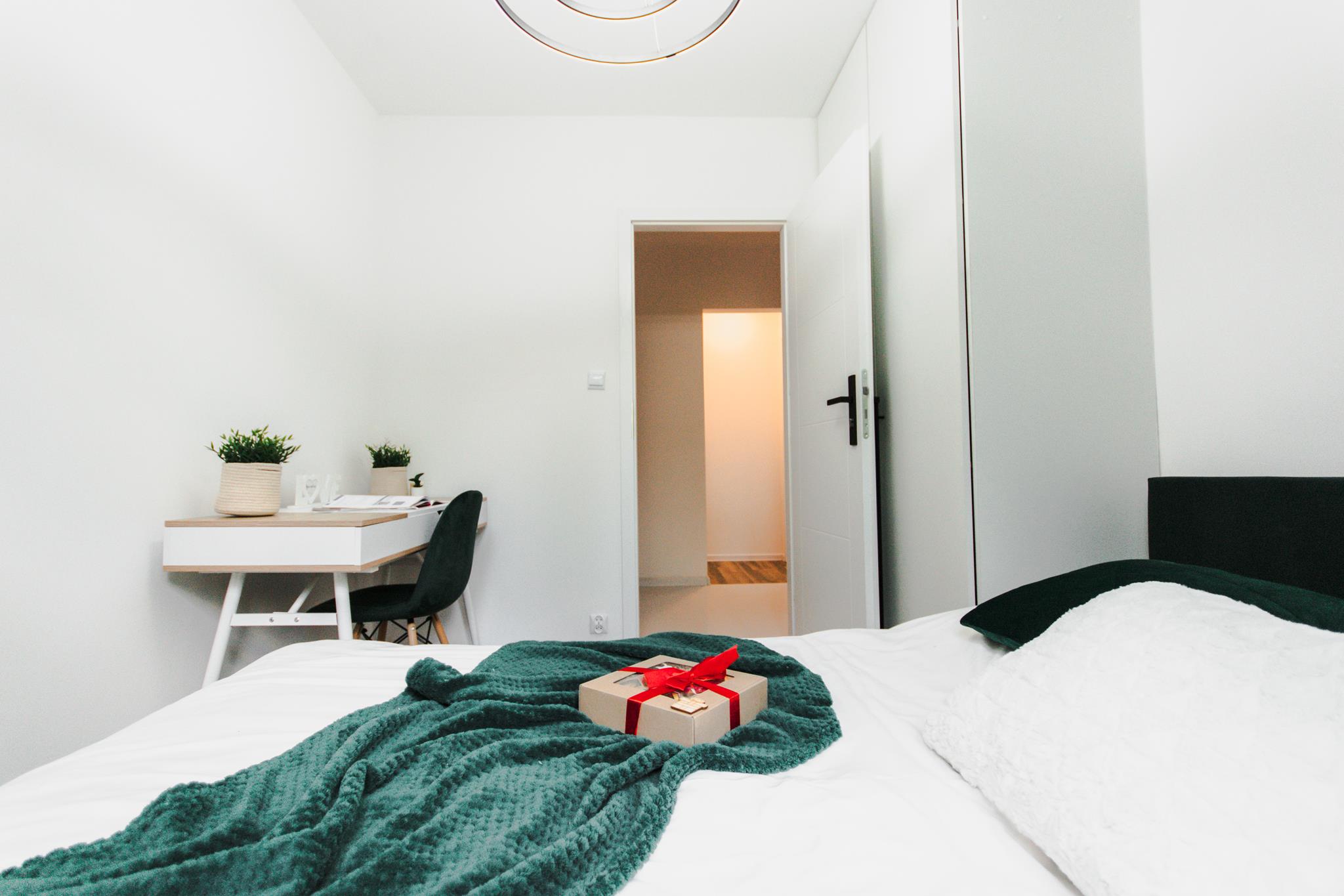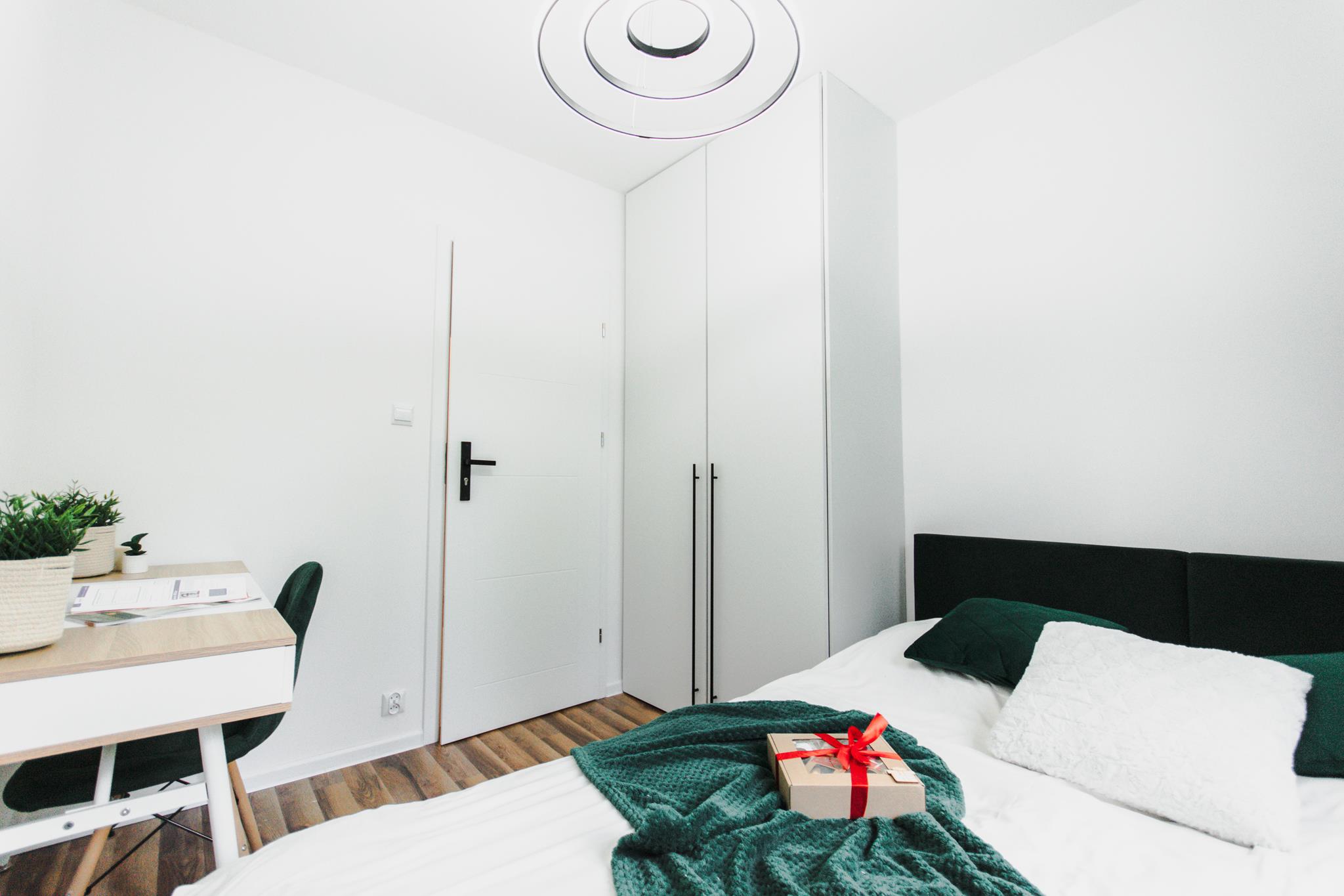 🛌 Trzy niezależne pokoje, każdy wyposażony w wygodne łóżko, pojemną szafę z lustrem oraz biurko z krzesłem do pracy lub nauki