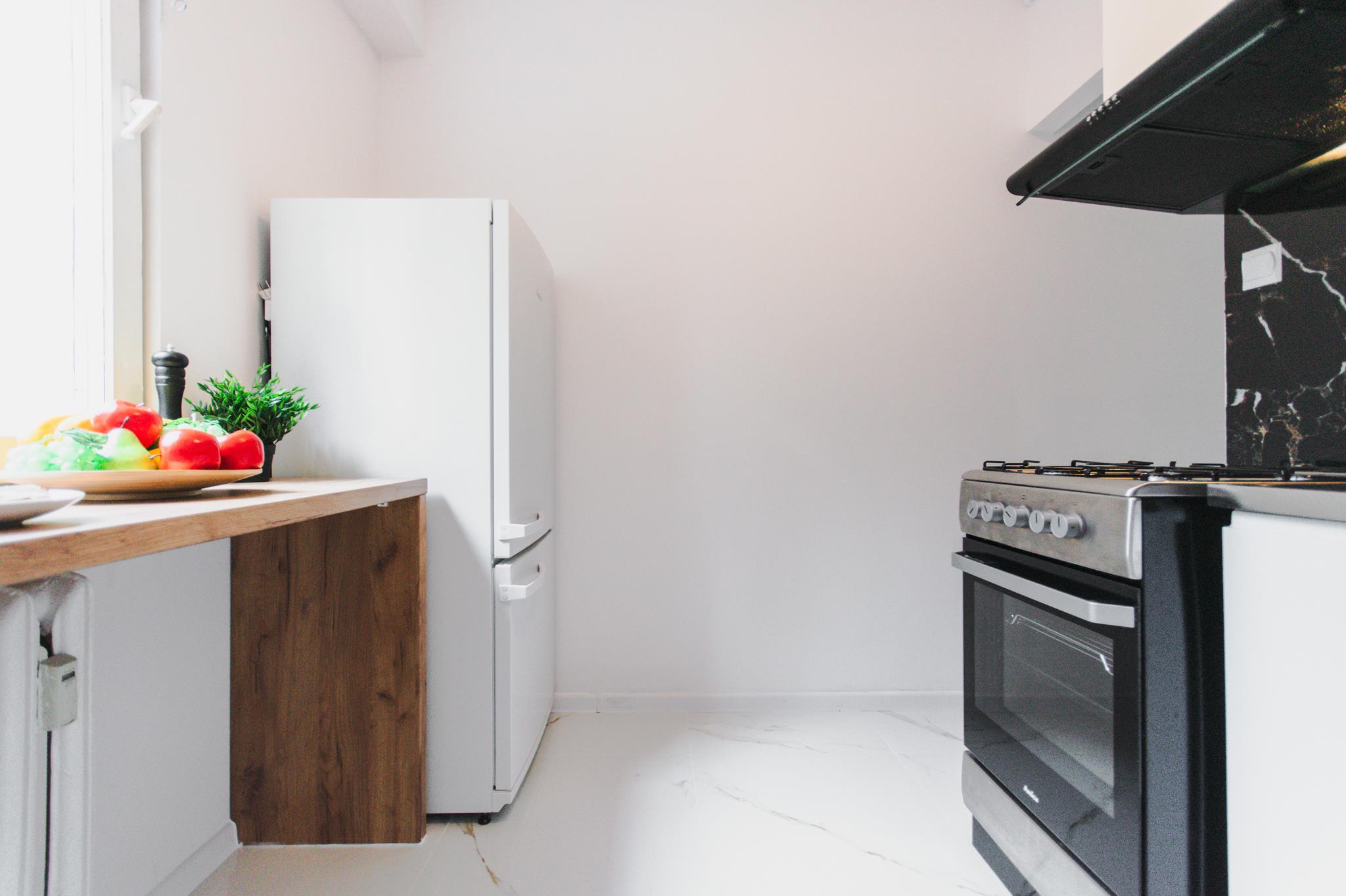 Przedpokój wyposażony w dużą, pojemną szafę do przechowywania ubrań wierzchnich oraz rzeczy mniej użytkowanych oraz pralkę. Przestronna kuchnia, w której znajdziesz wszystkie niezbędne sprzęty AGD, takie jak: