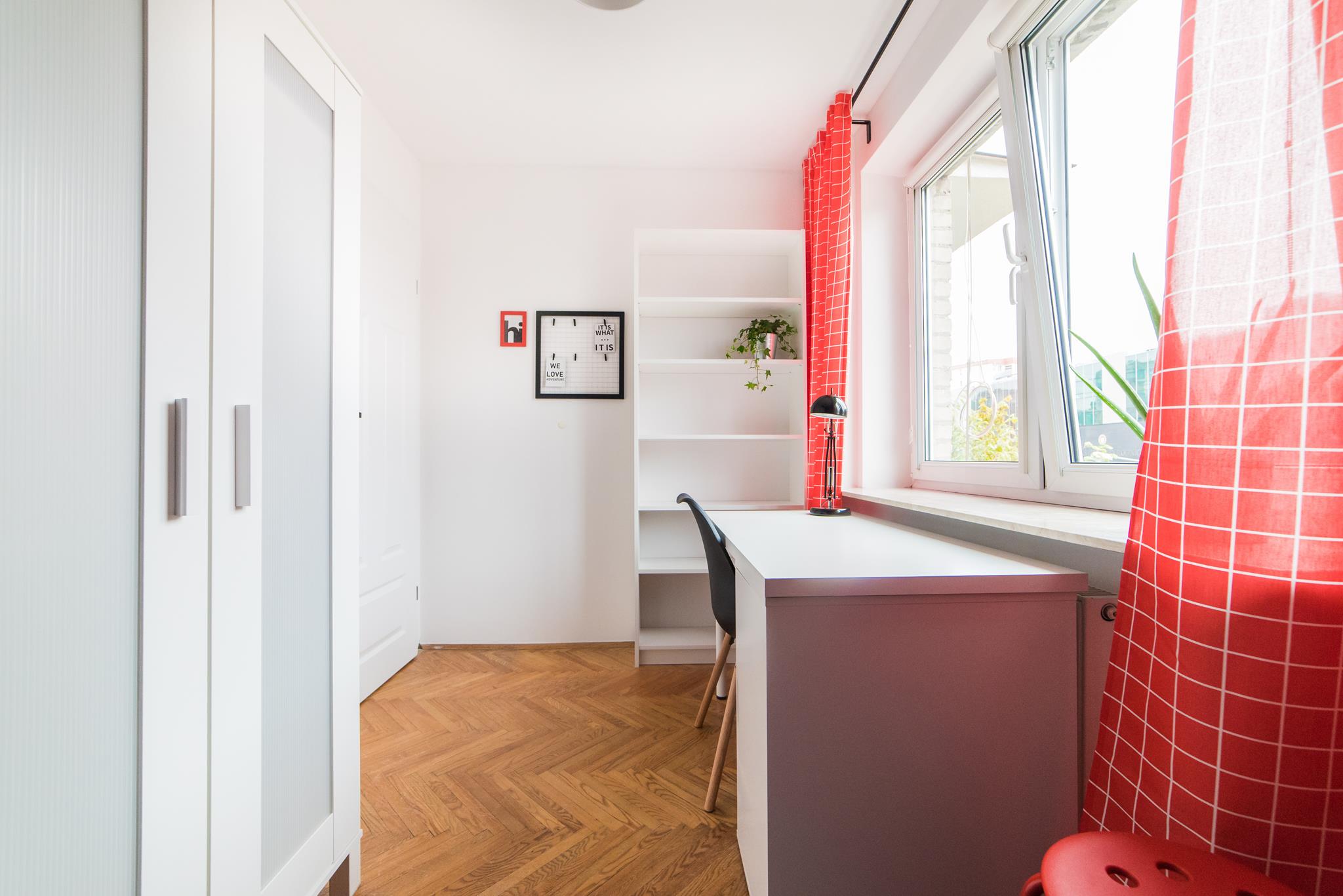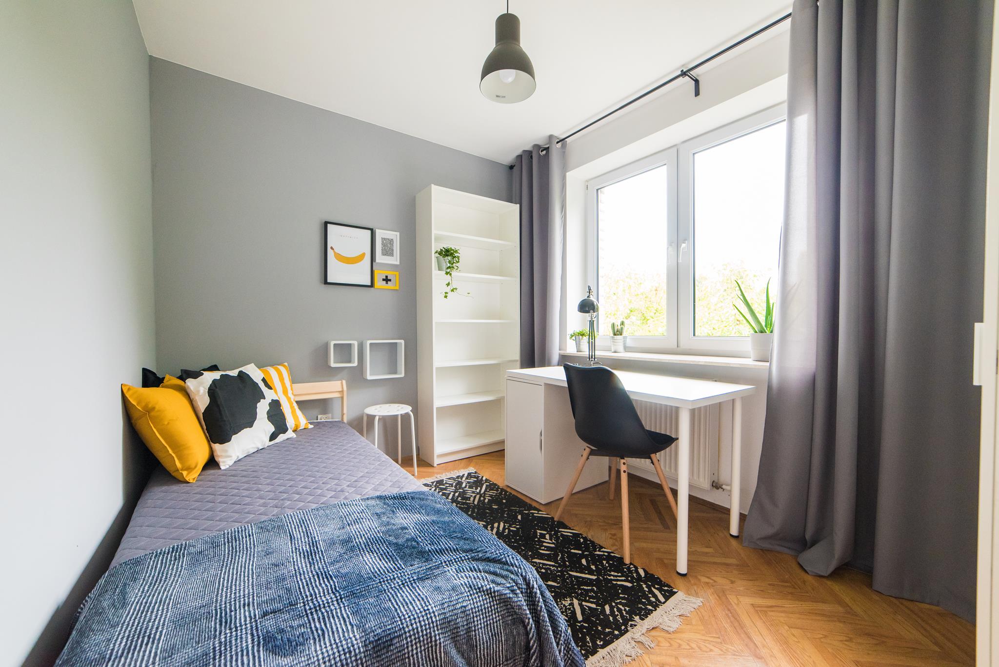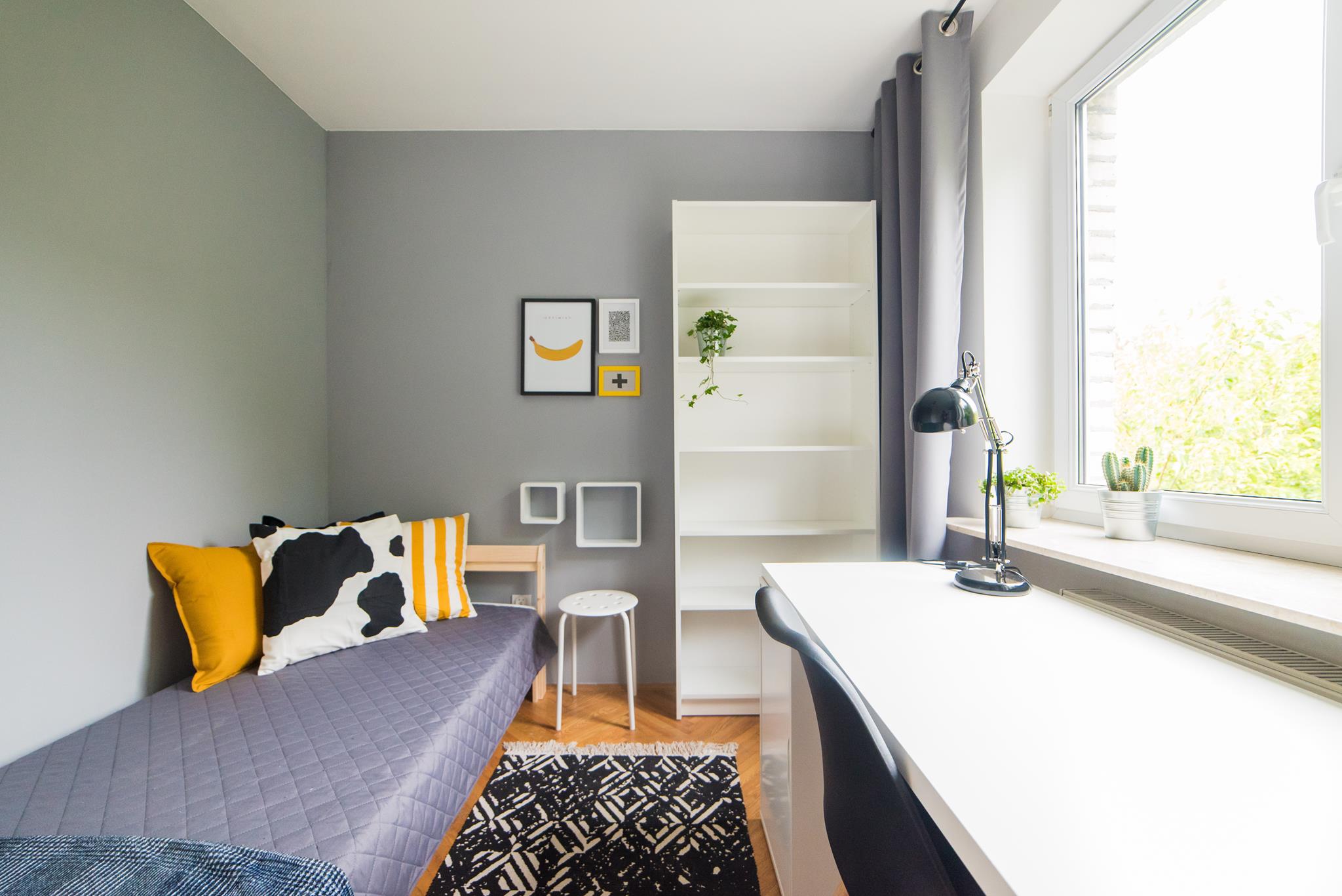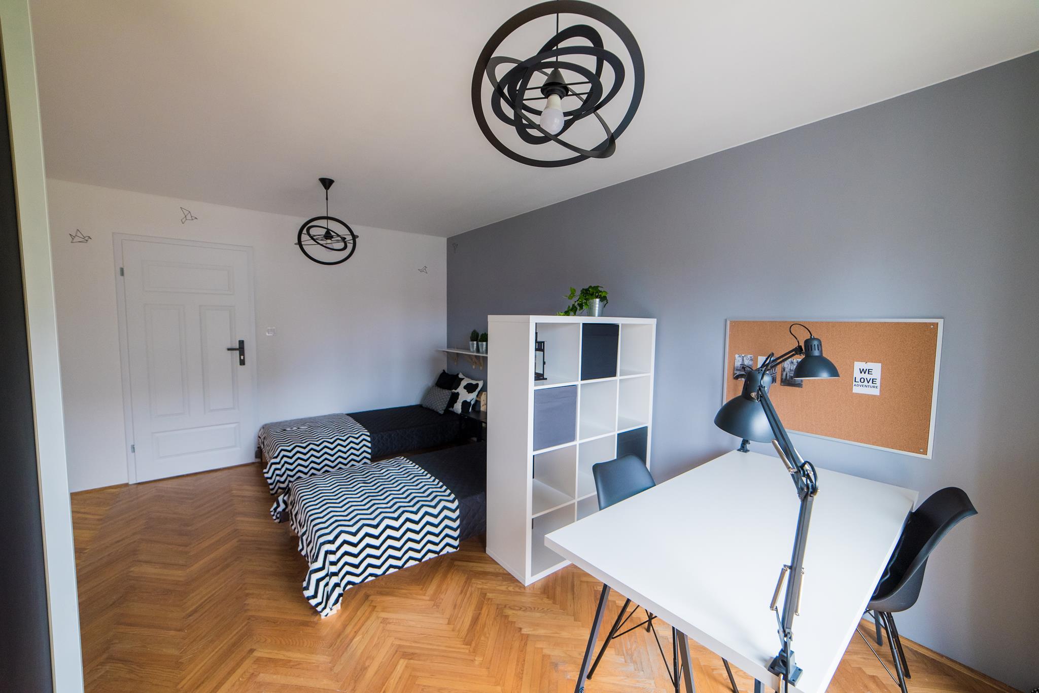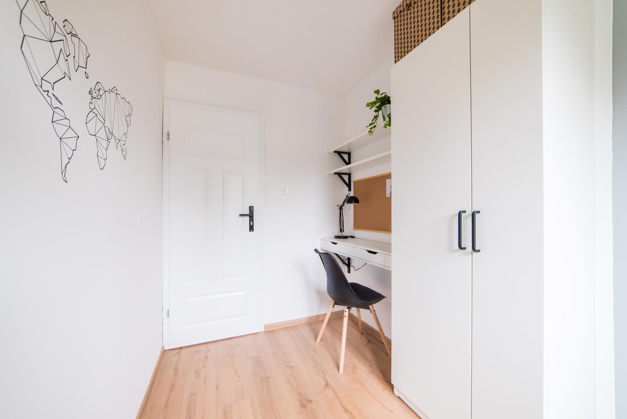 Do dyspozycji mamy 4 niezależne pokoje, w każdym z nich znajduje duża, pojemna szafa, w której można spokojnie zmieścić wszystkie swoje rzeczy, łóżko z materacem/wygodna kanapa oraz biurko z krzesłem idealnym do pracy czy nauki.