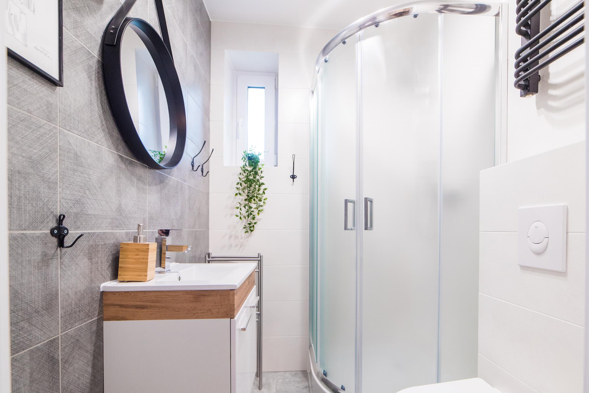 Łazienka z dużym prysznicem, nowoczesną umywalką, miejscem do przechowywania oraz lustrem.