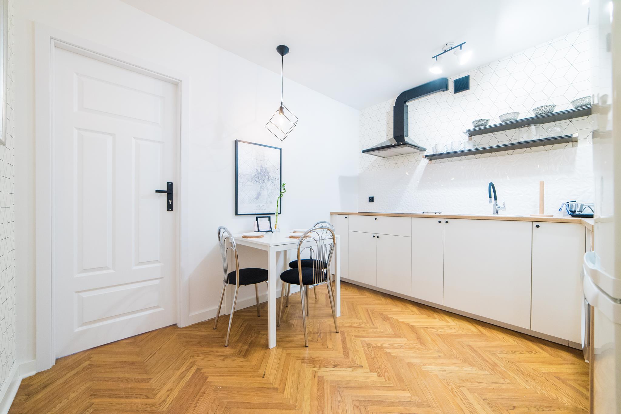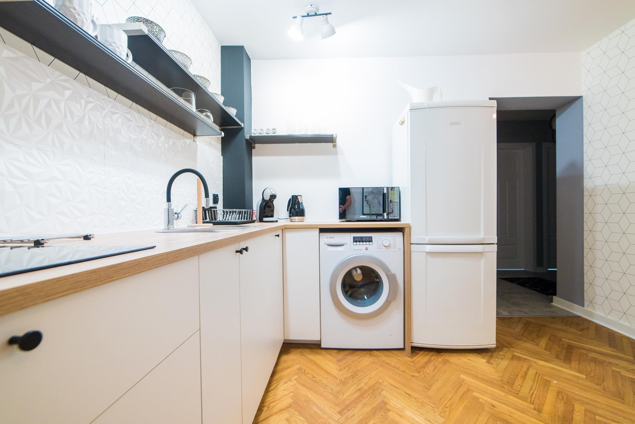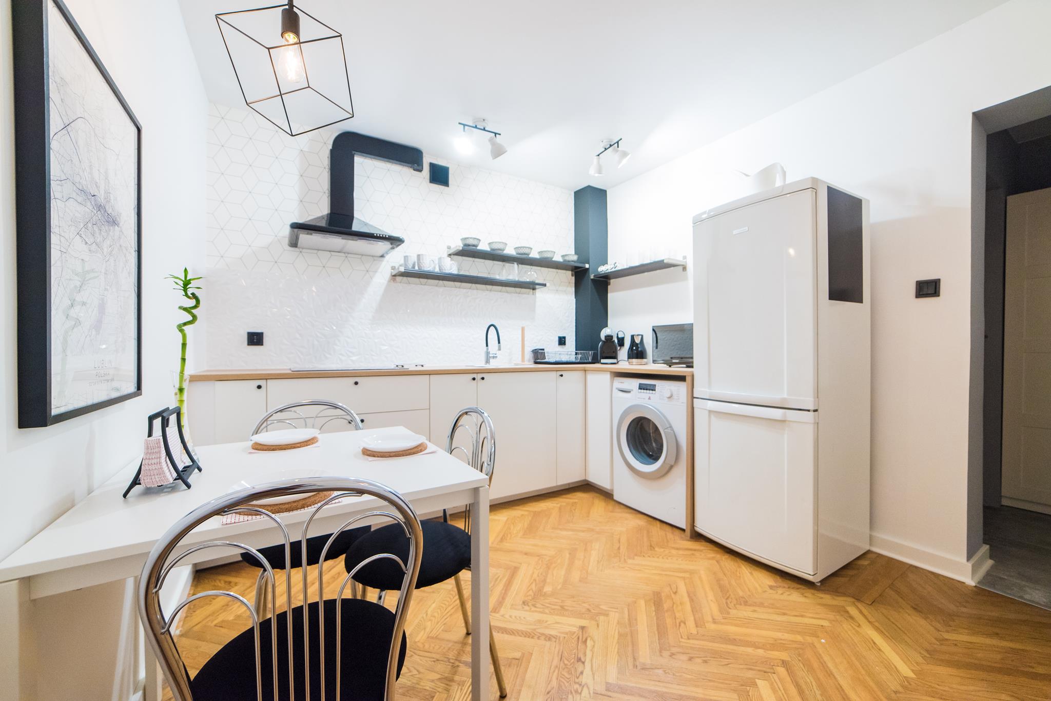 🍳 Duża kuchnia z pełnym wyposażeniem, pralką oraz stołem z krzesłami