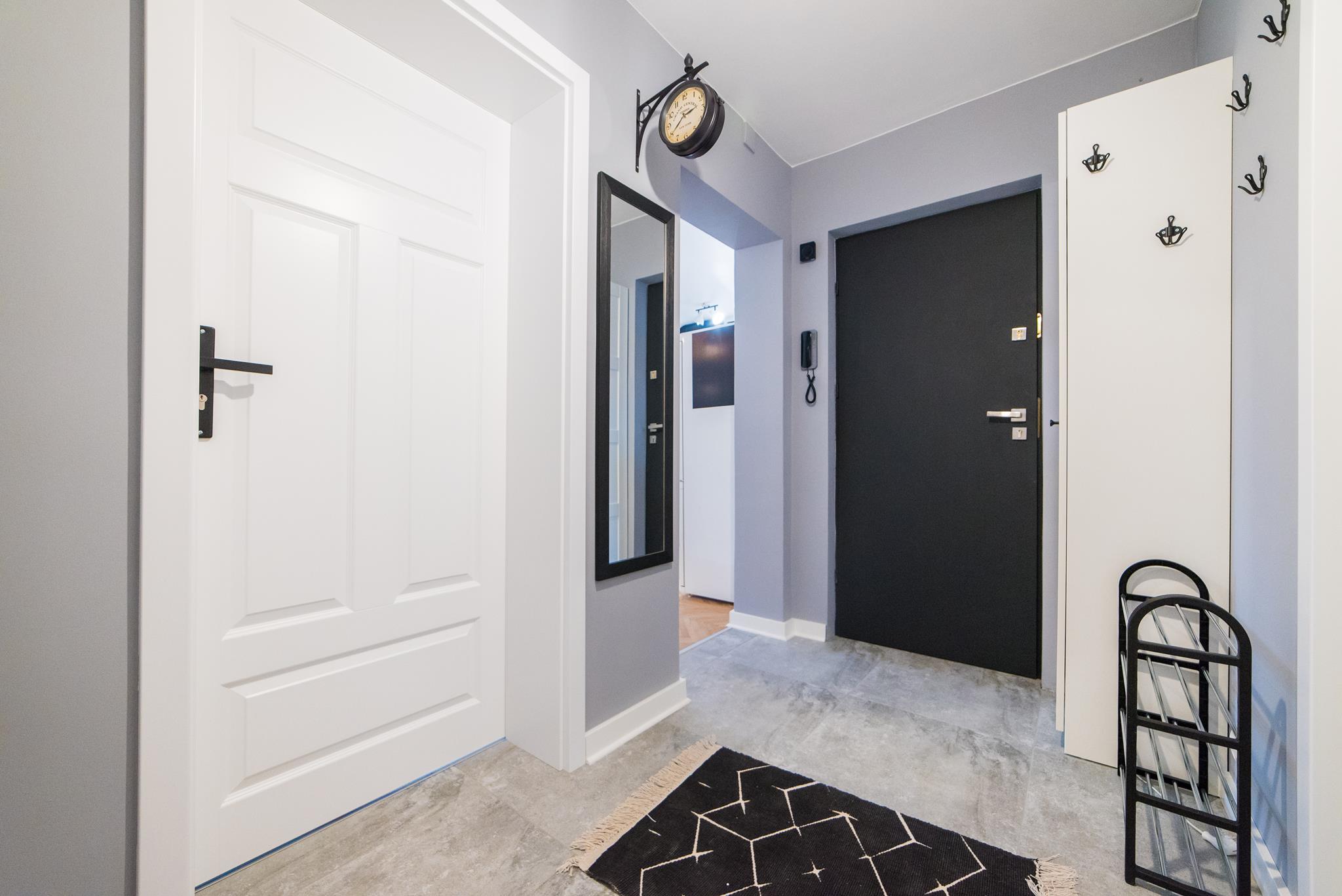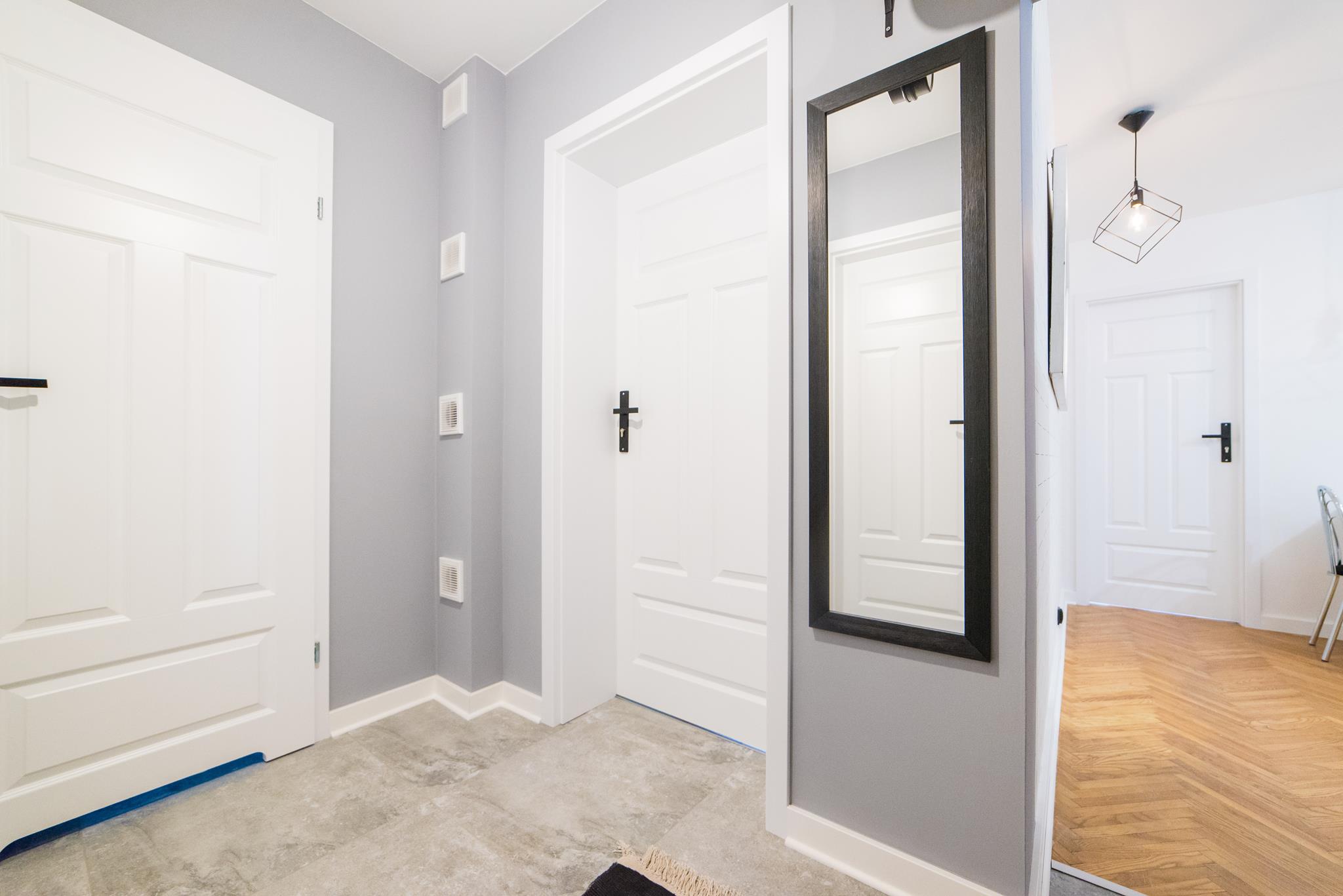 Przedpokój z dużą szafą, miejscem do przechowywania oraz lustrem.