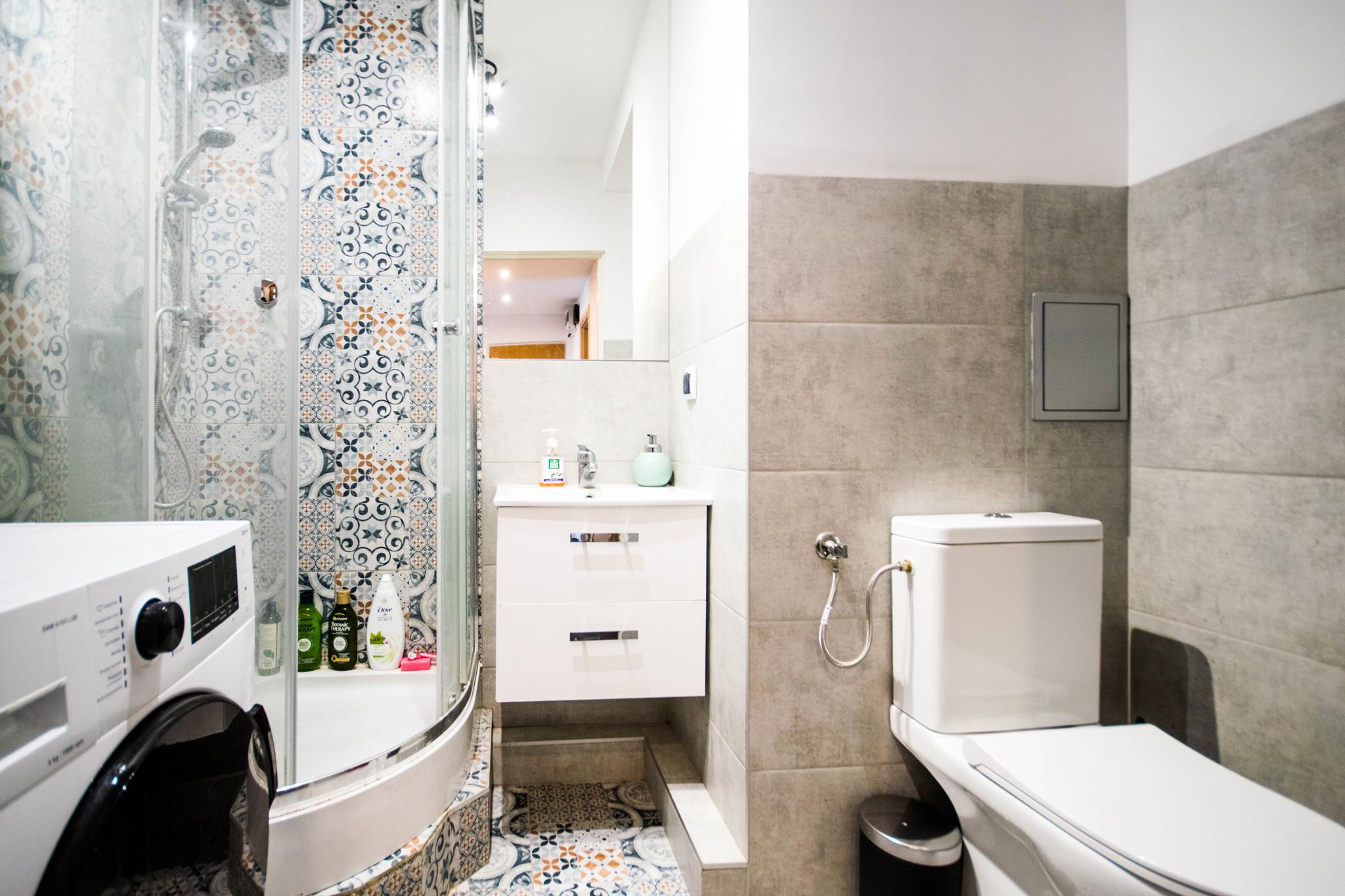 Łazienka z dużym prysznicem, pralką, umywalką i lustrem.